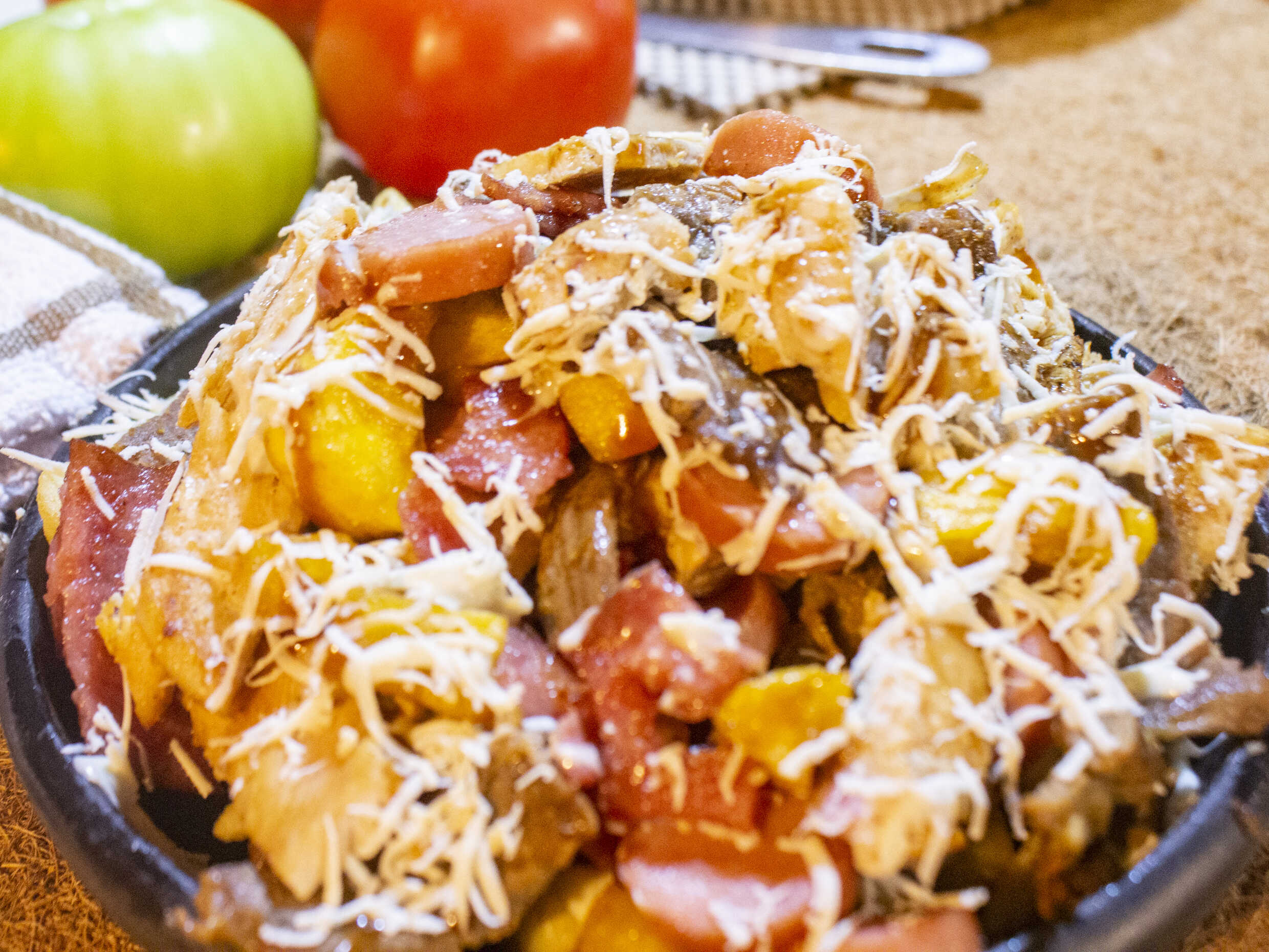 Papas a la francesa, salchicha alemana, pollo, carne, maduro, queso y tocineta.