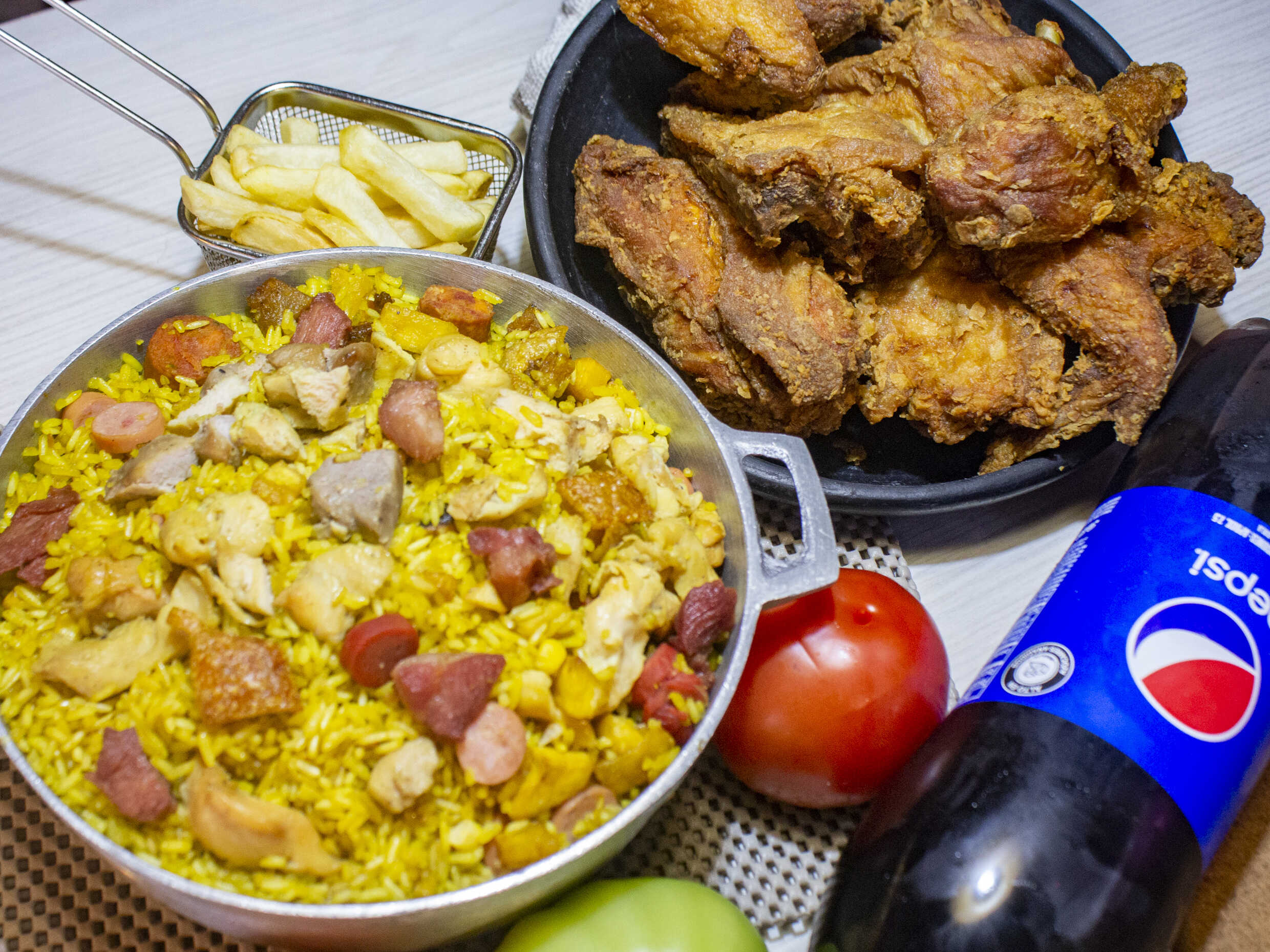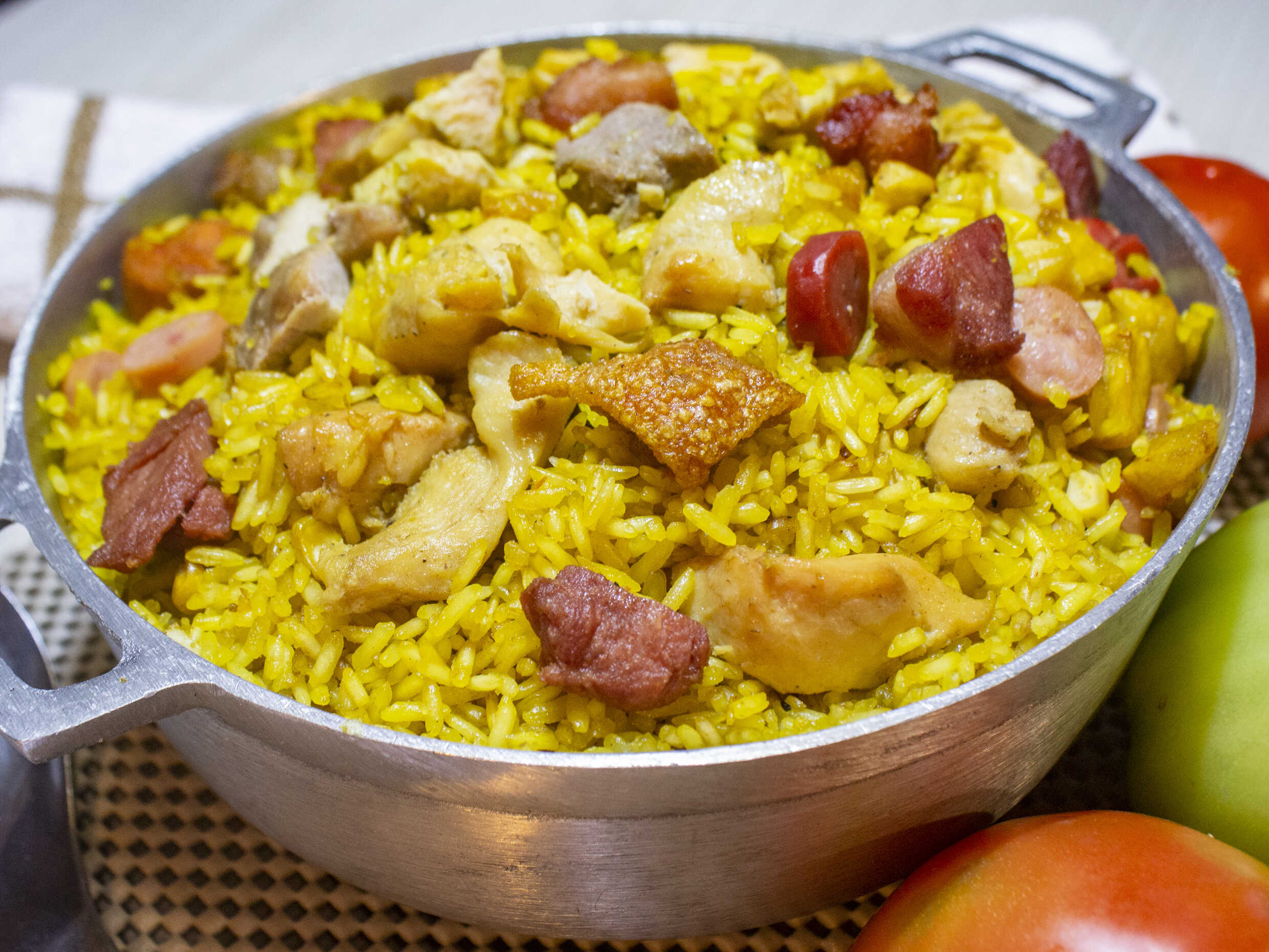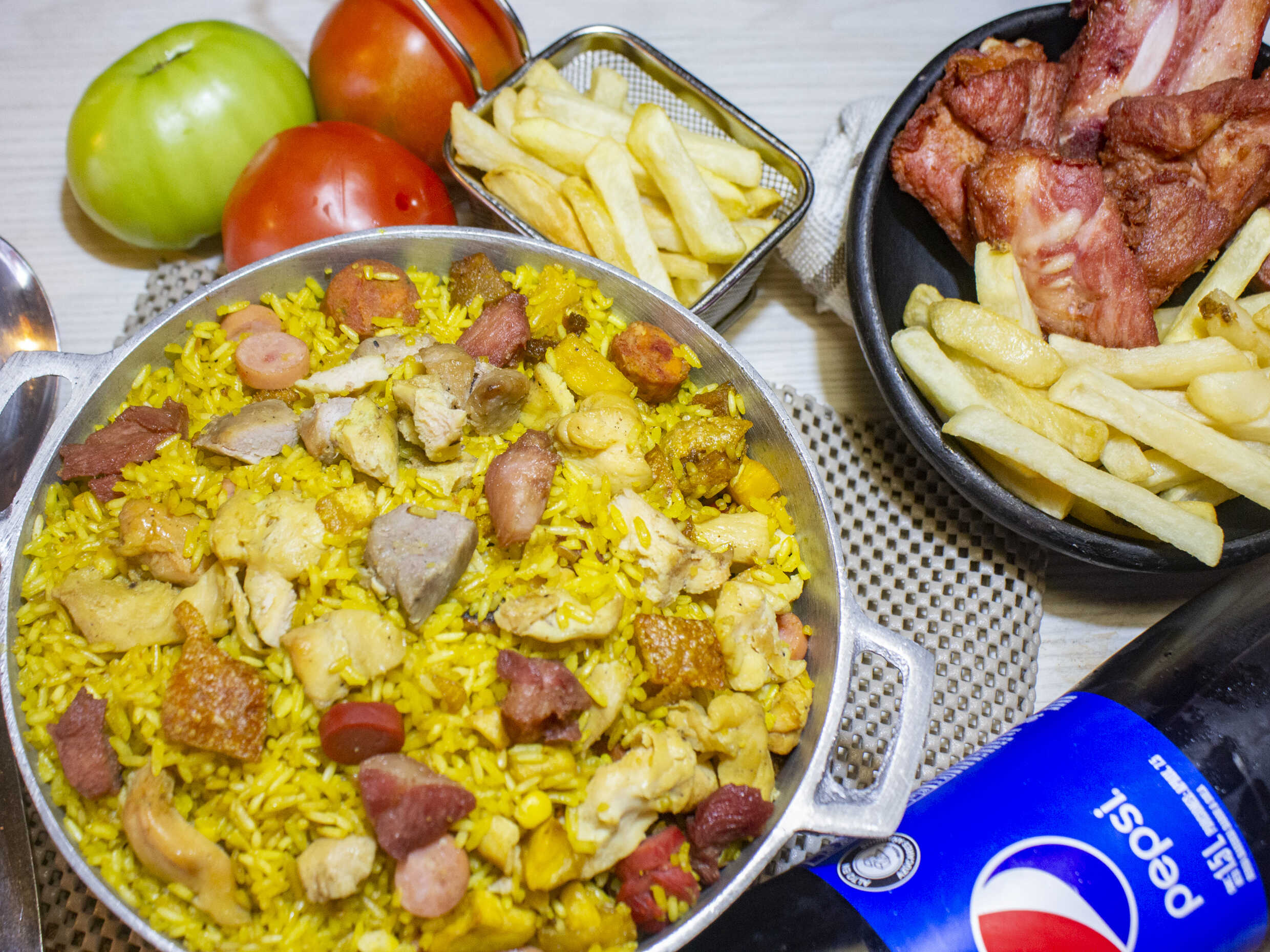 Delicioso arroz con lomo, chicharrón, plátano maduro, maíz tierno, pollo, chorizo, camarón, salchicha