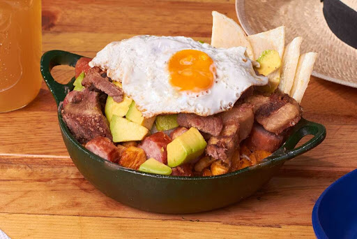 La original paisa, especial para 2 personas, con frijol, arroz chicharrón,, carne de res en trozos, chorizo paisa, huevito, plátano maduro, arepa y aguacate