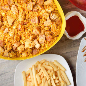 Arroz Ranchero Familiar: Delicioso arroz con lomo, chicharrón, plátano maduro, maíz tierno, chorizo, salchicha. + Proteína a elección + Papa Francesa + Gaseosa 1.5 Lt*1