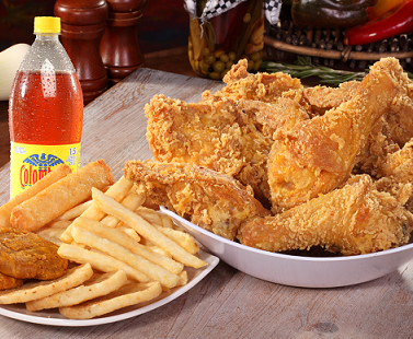 1 Pollo y medio broaster, 500 g de papa francesa, 7 croquetas de yuca, 7 patacones, 1 gaseosa 1.5 L