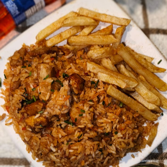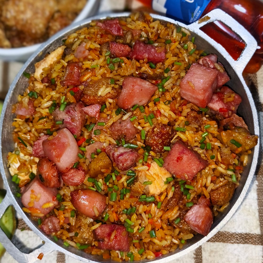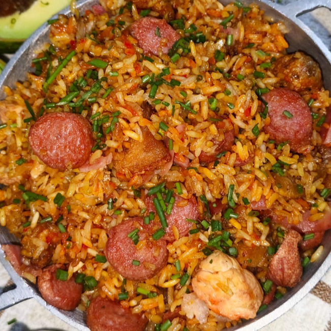 Delicioso arroz con lomo, chicharrón, plátano maduro, pollo, chorizo, camarón, salchicha. Peso: 700gr.