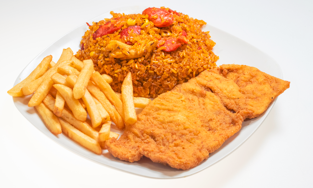 Arroz paisa, pernil de cerdo, pollo, chicharrón, plátano, maduro y maicitos, acompañado con pollo frito.