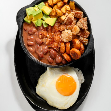 300 gms de frijol, chicharrón crujiente, plátano maduro, maíz tierno, chorizo, aguacate, huevo frito, acompañado de arroz blanco