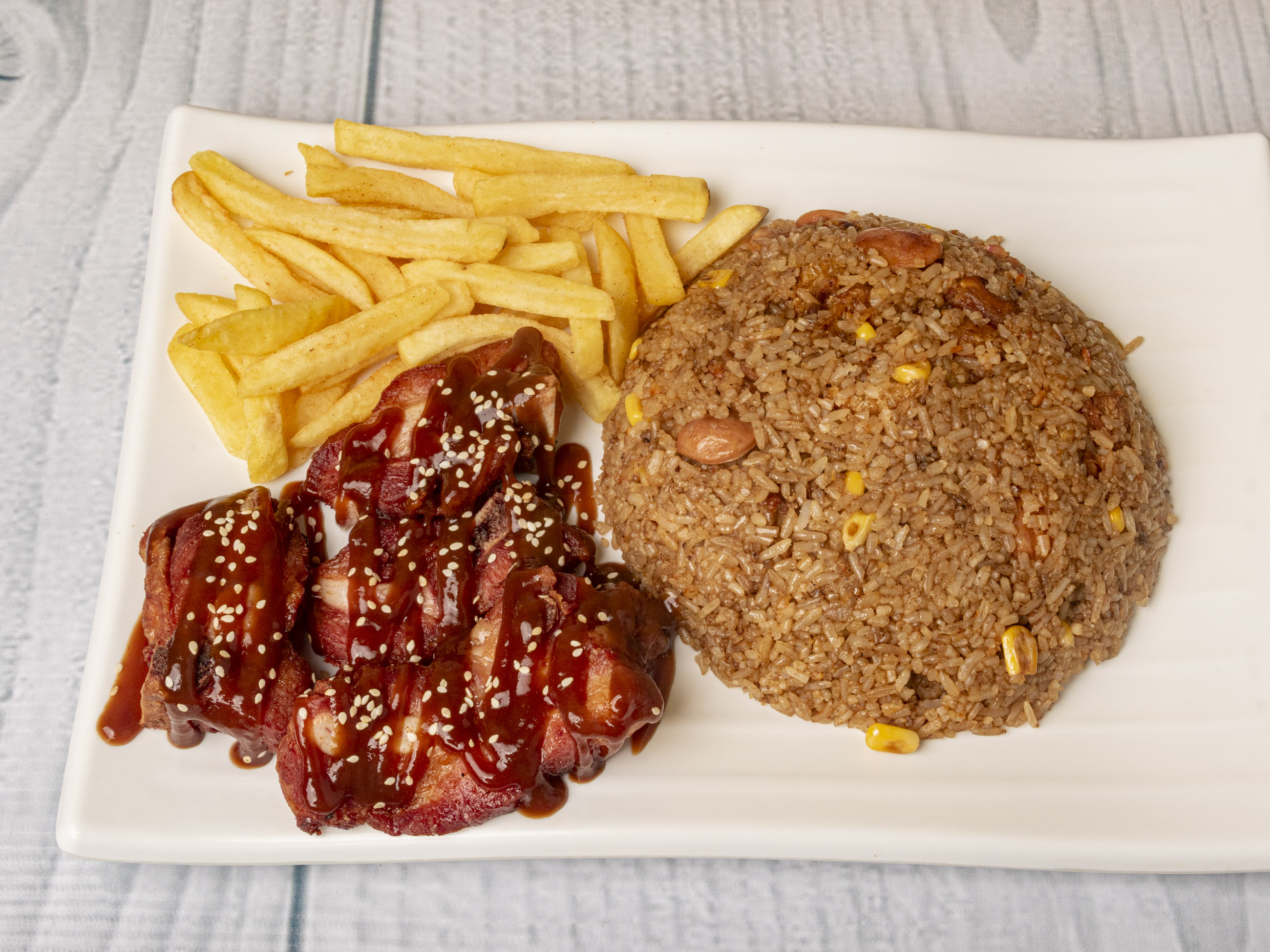 Porcion de Arroz Paisa + Papas a la Francesa + Costillas BBQ + Gaseosa Postobón 250 ml