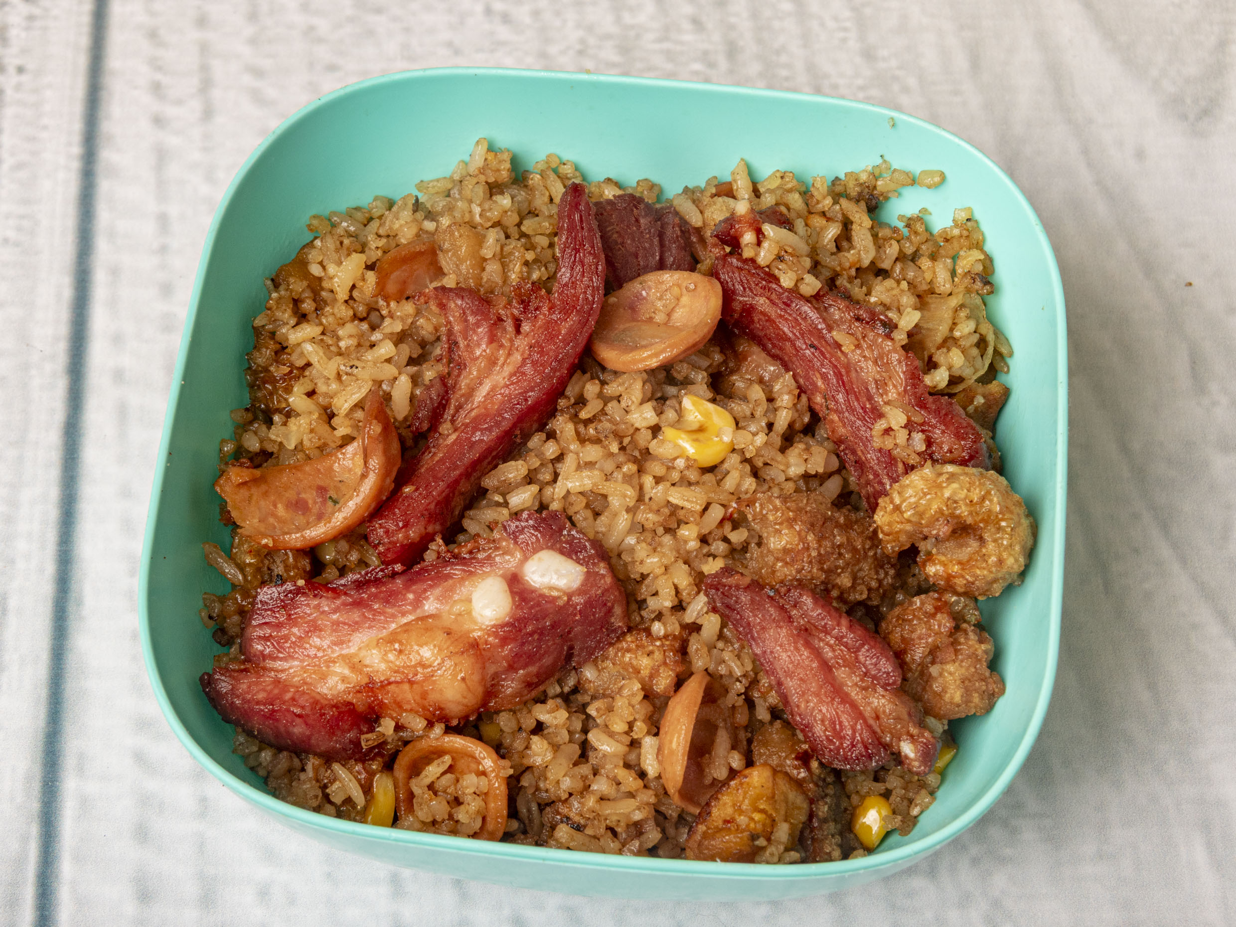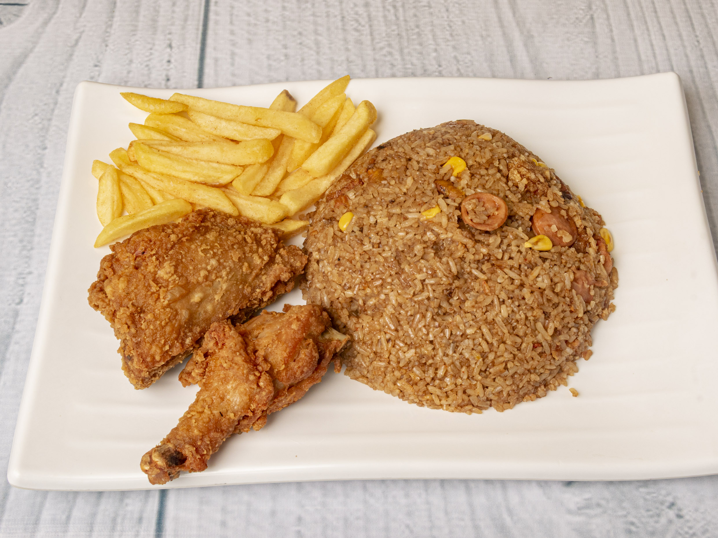 Arroz chino con pollo, cerdo, jamón, raíces, cebollín + 1/2 de pollo + bebida 1.5