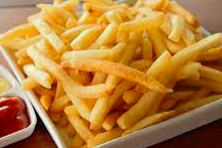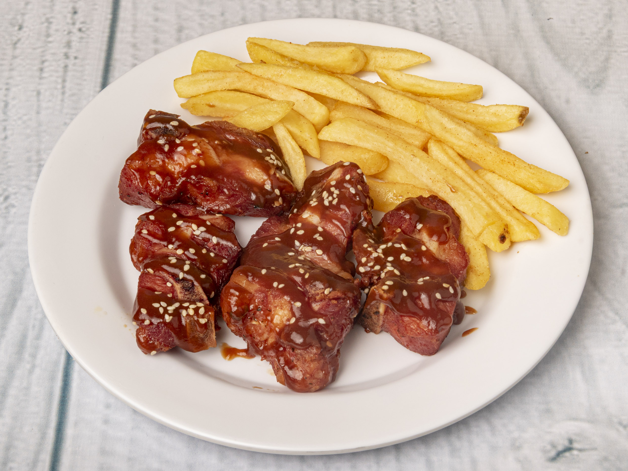 Costillas Bbq ( 300 gramos ) acompañadas de papas a la francesa ( 150 gramos ) , salsas por aparte de bbq, ají, tomate.