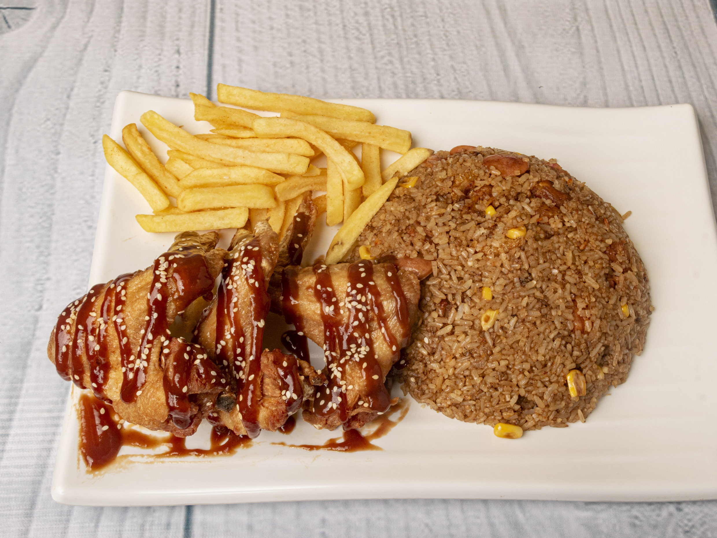 Porción de Arroz Paisa + Papas a la Francesa + Gaseosa Postobón 250 ml + Alitas BBQ