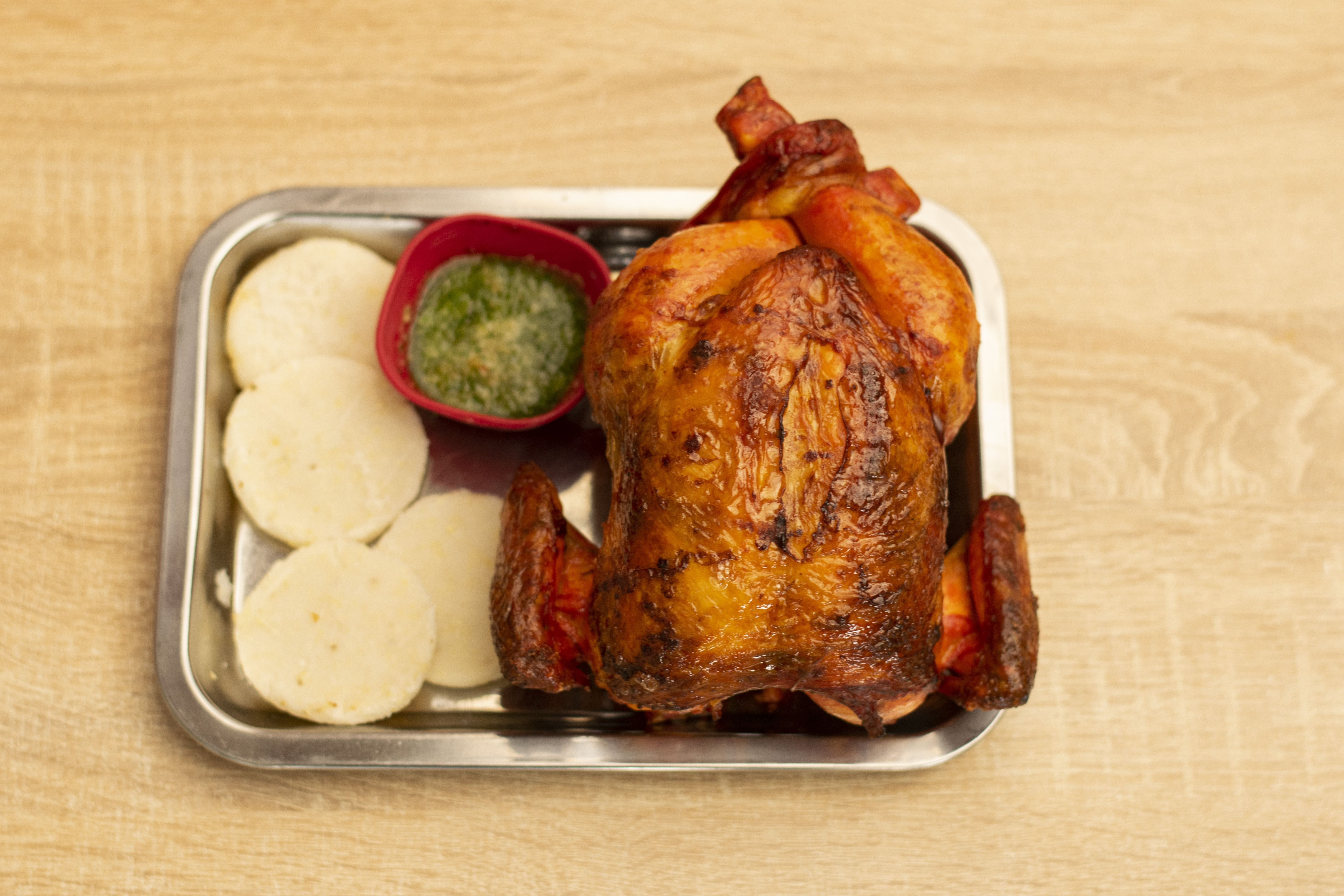 Pollo asado con arepa.