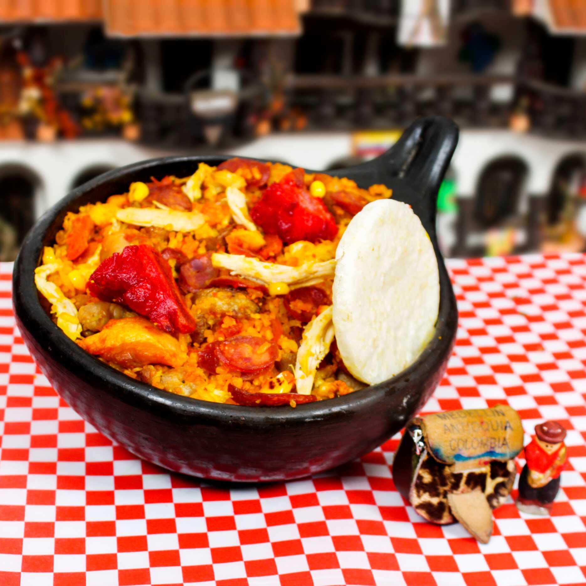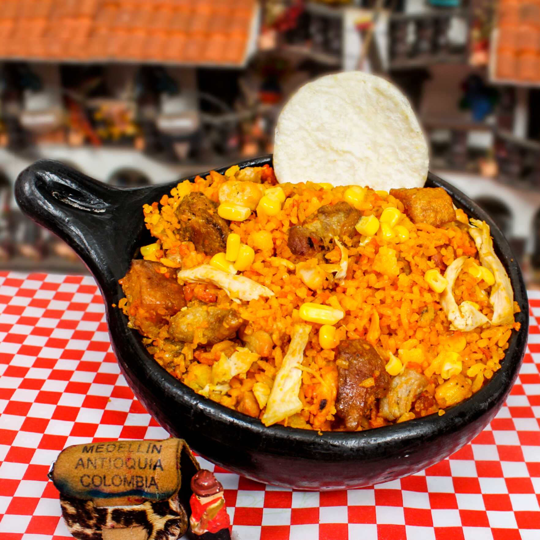 arroz con chicharron,maduro,maiz tierno,salchicha,chorizo,cerdo,pollo picado,4 camarones mas 2 arepas