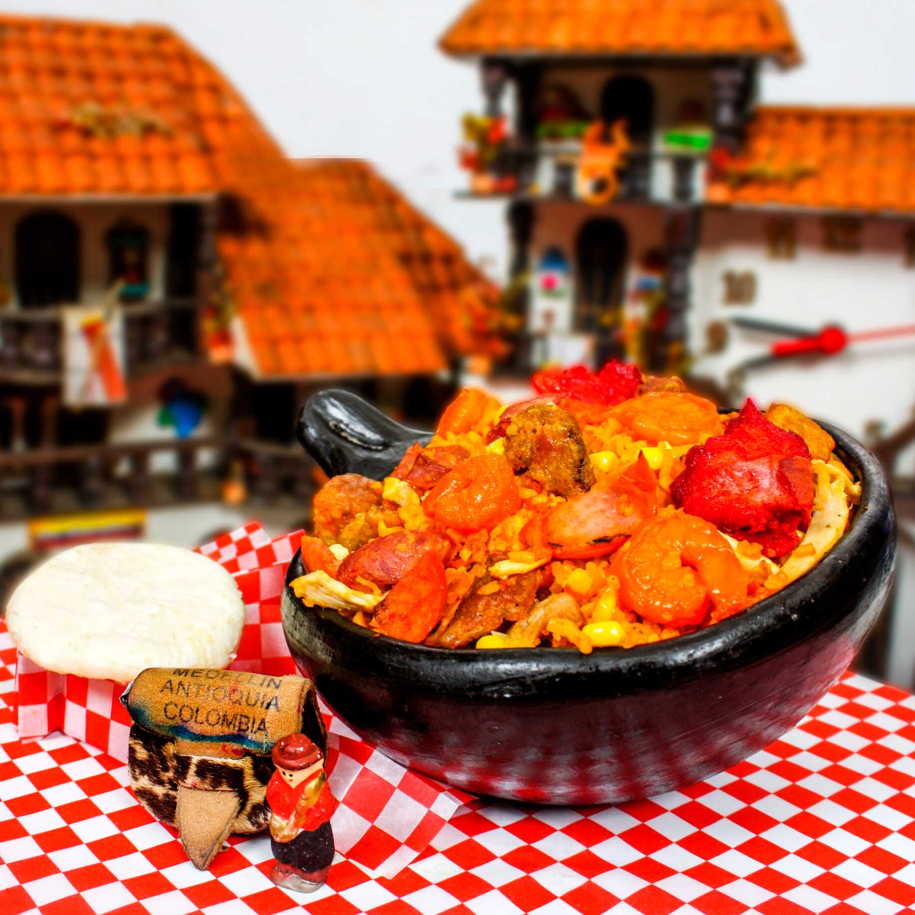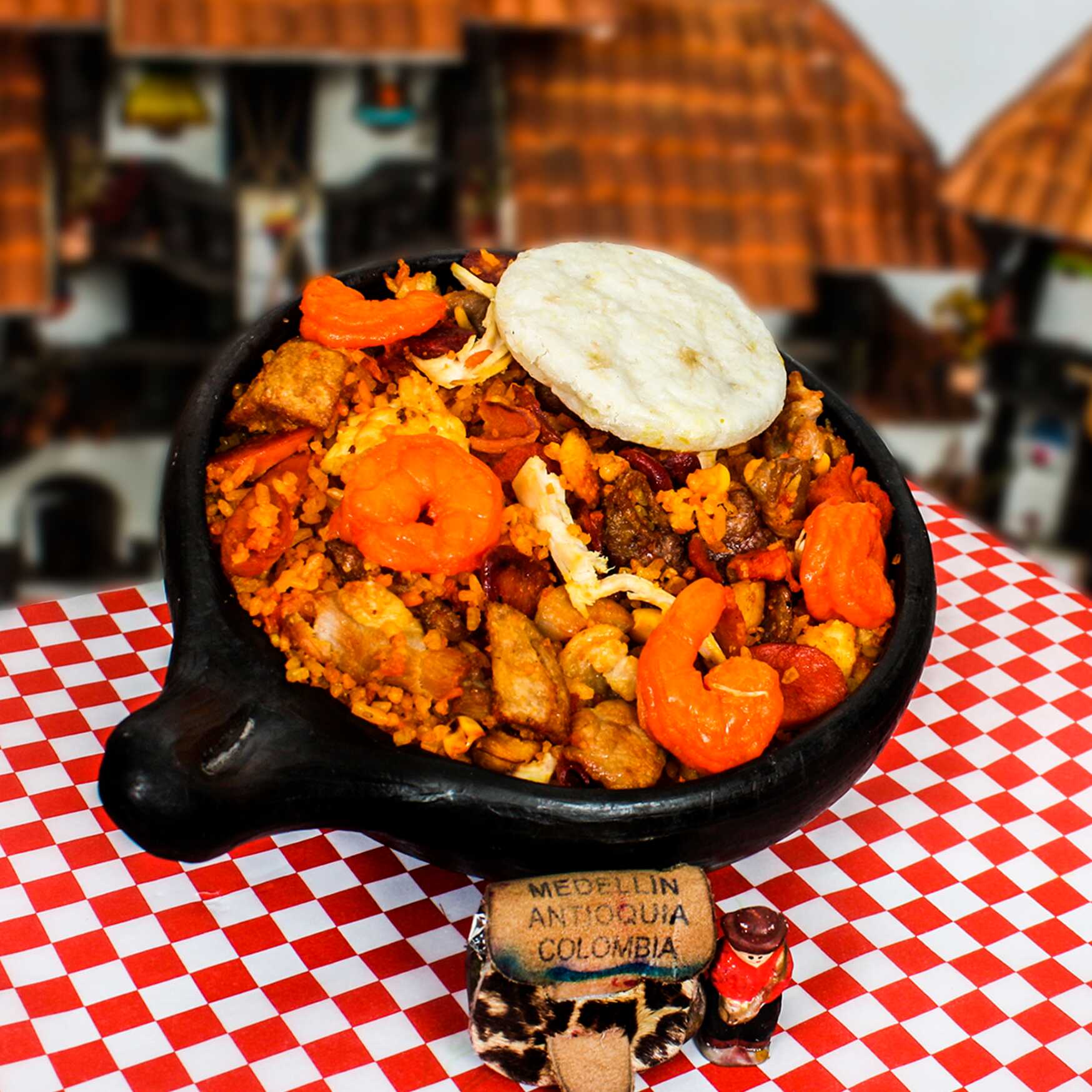 arroz con chicharron,maduro,maiz tierno,salchicha,chorizo,cabano,costilla,cerdo,pollo picado,12 camarones mas 6 arepas