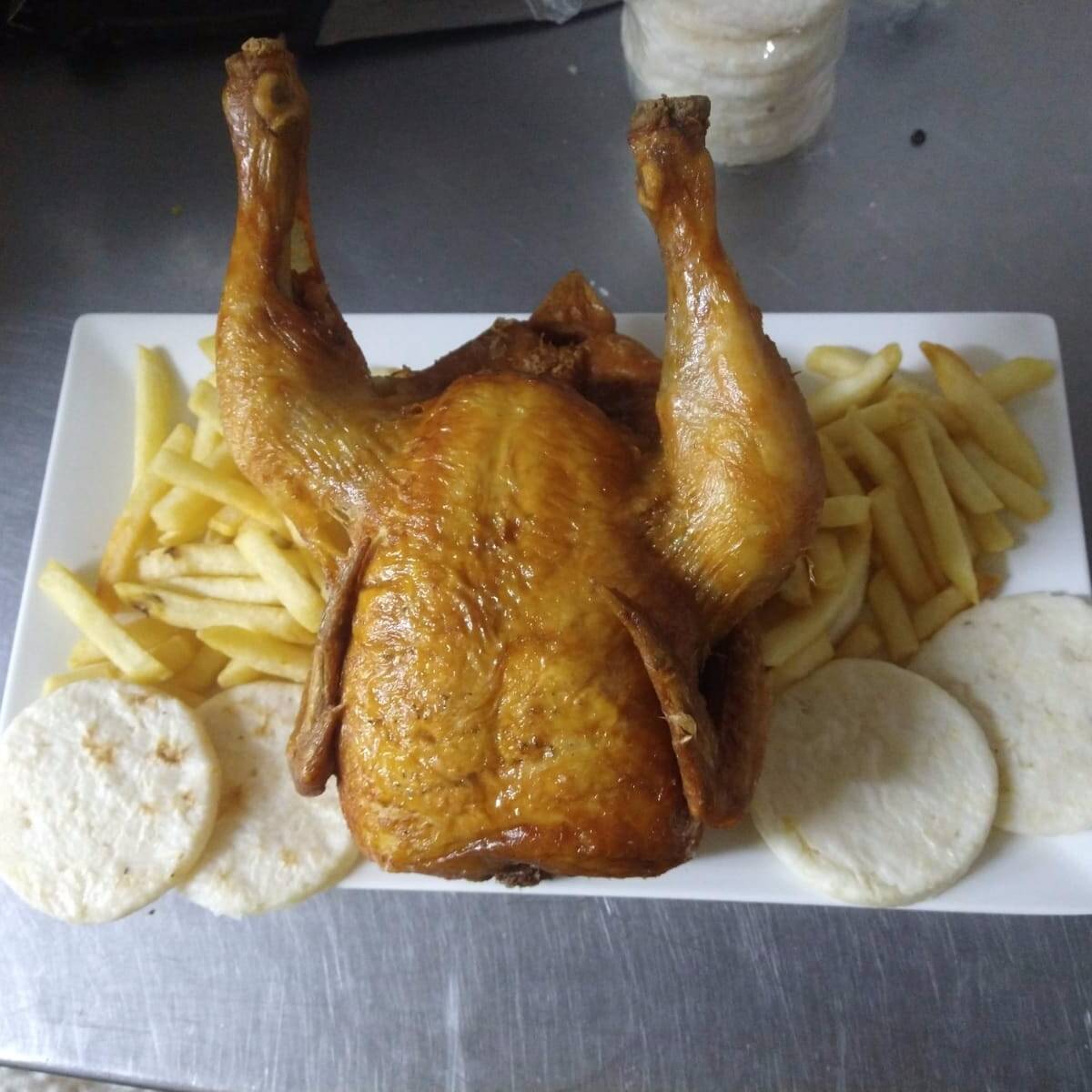 1/2 POLLO FRITO (4 PRESAS) + PAPA A LA FRANCESA + 2 AREPAS