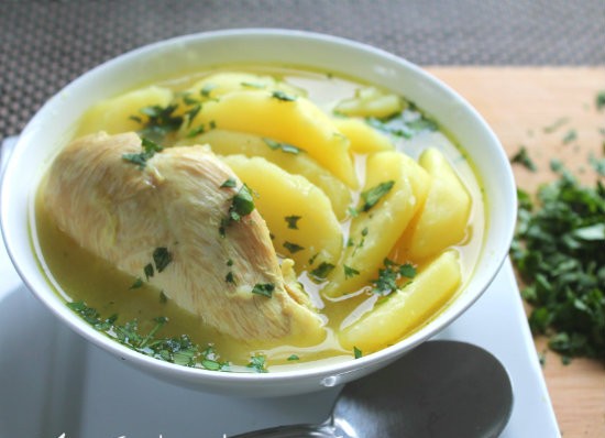 Delicioso caldo de pollo con el auténtico sabor de hogar, servido bien caliente y acompañado de una suave arepa sencilla.