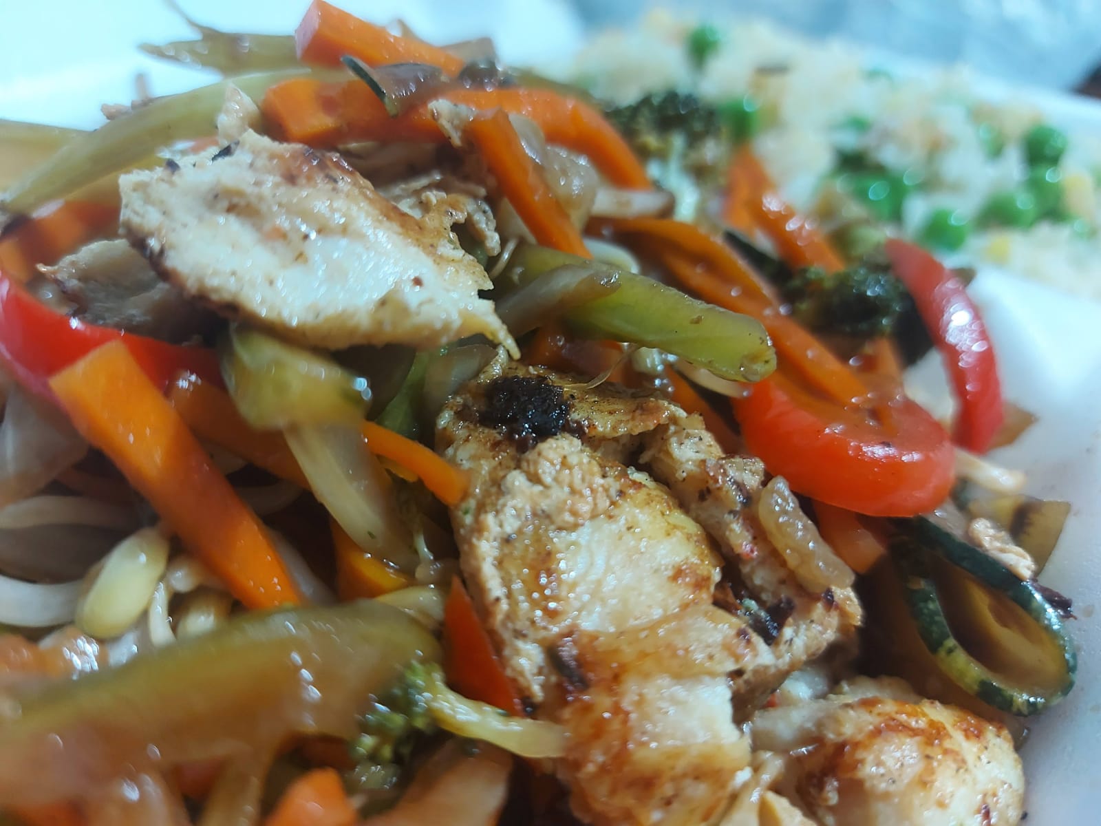Cebollín, pimentón en cuadros, zanahoria en cuadros, pollo o cerdo en salsa teriyaki, soya.