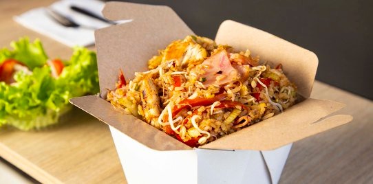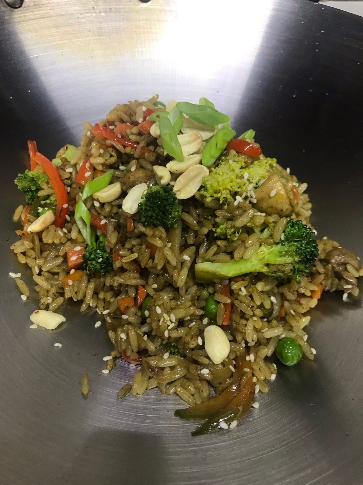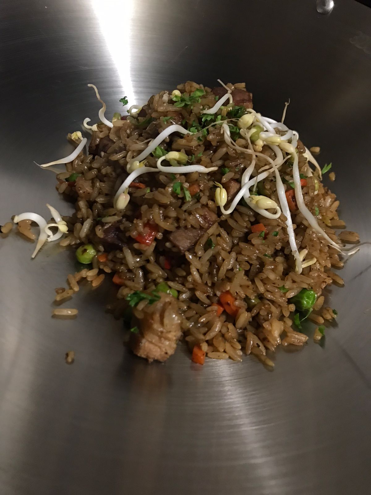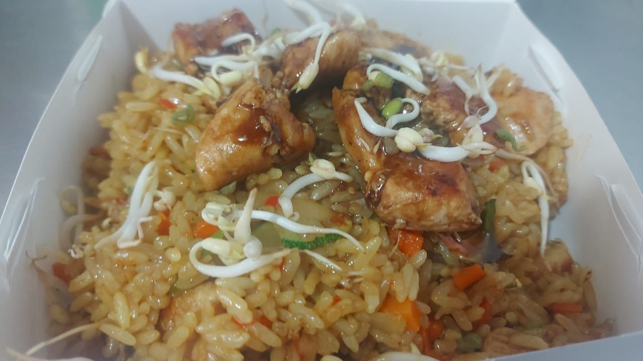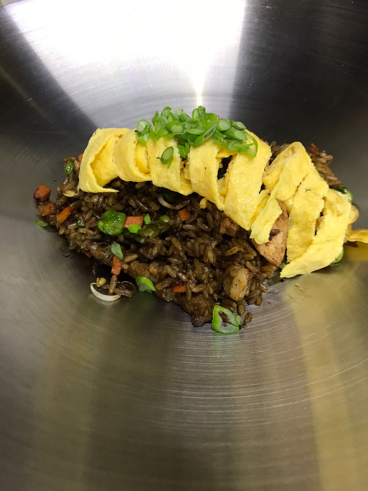 Pollo, cerdo, huevo, zanahoria en cuadros, arveja, cebollín, salsa soya y ajonjolí.