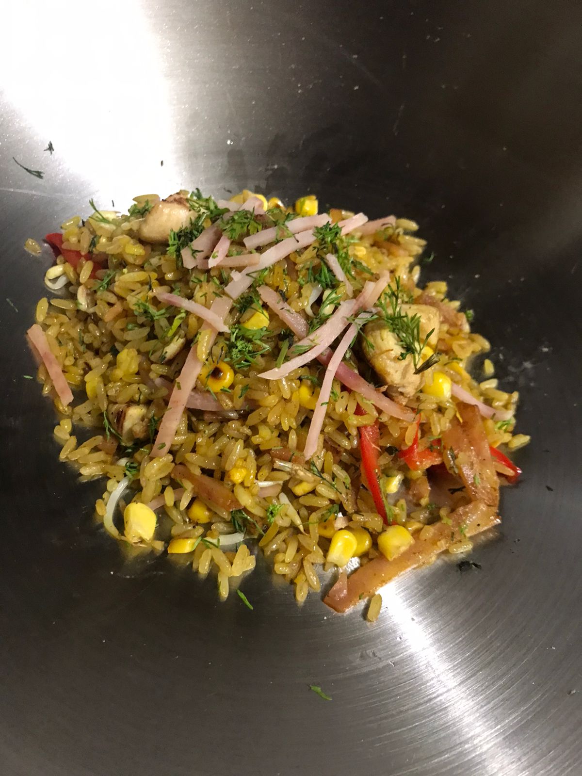 Huevo revuelto, jamón, pollo, raíces chinas, cebollín, raíces chinas, salsa soya.