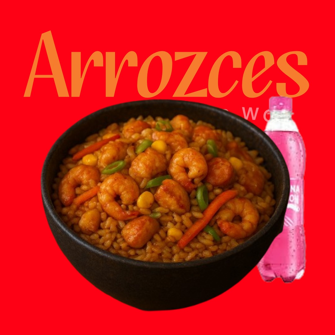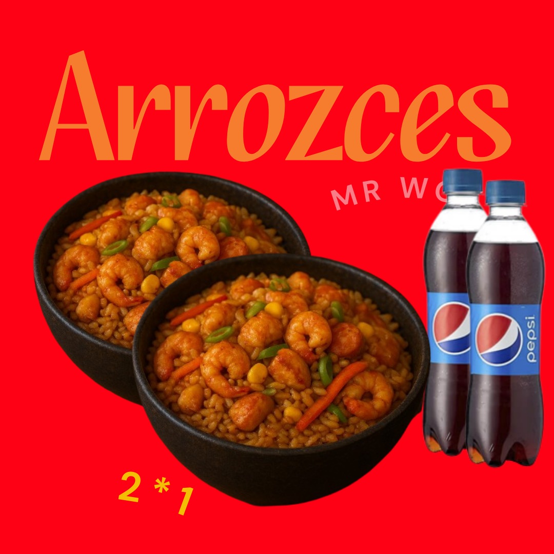 Dos arroces salteados con mixtura de mariscos 2 gaseosas Postobón 250 ml.