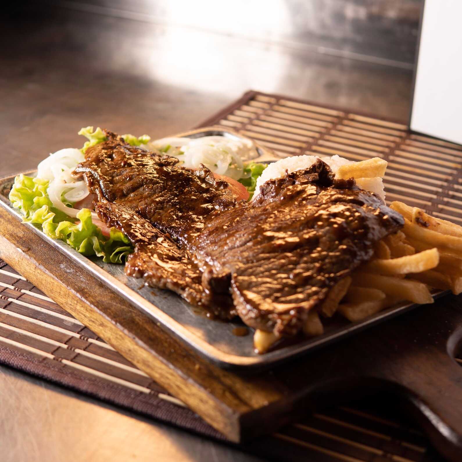 Churrasco 220 g, arroz, ensalada de la casa, papas a la francesa o patacón, acompañado de chimichurri.