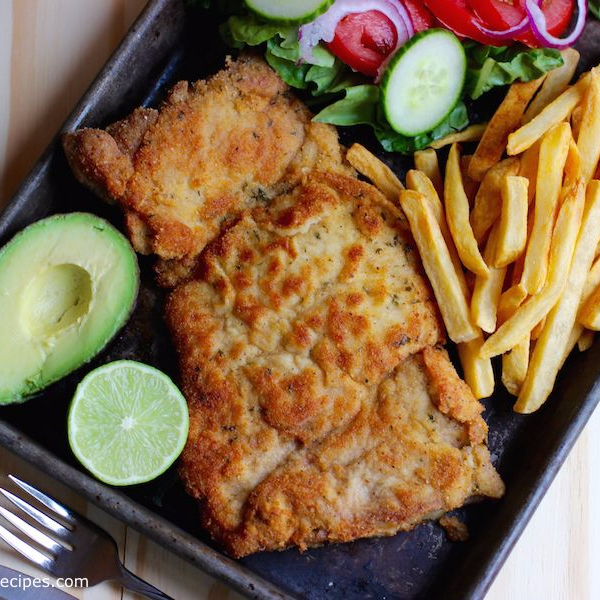Pechuga gratinada 220 g, arroz, ensalada de la casa, papas a la francesa o patacón, acompañado de chimichurri.