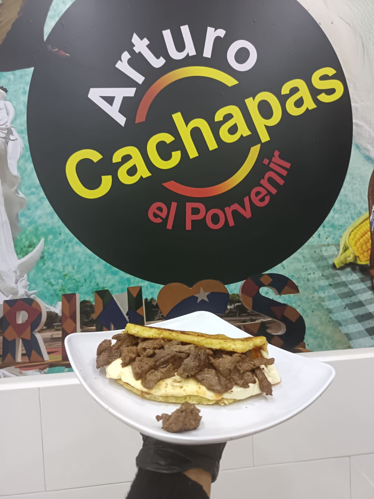 Cachapa con queso completo (200 g) y carne tipo parrilla.