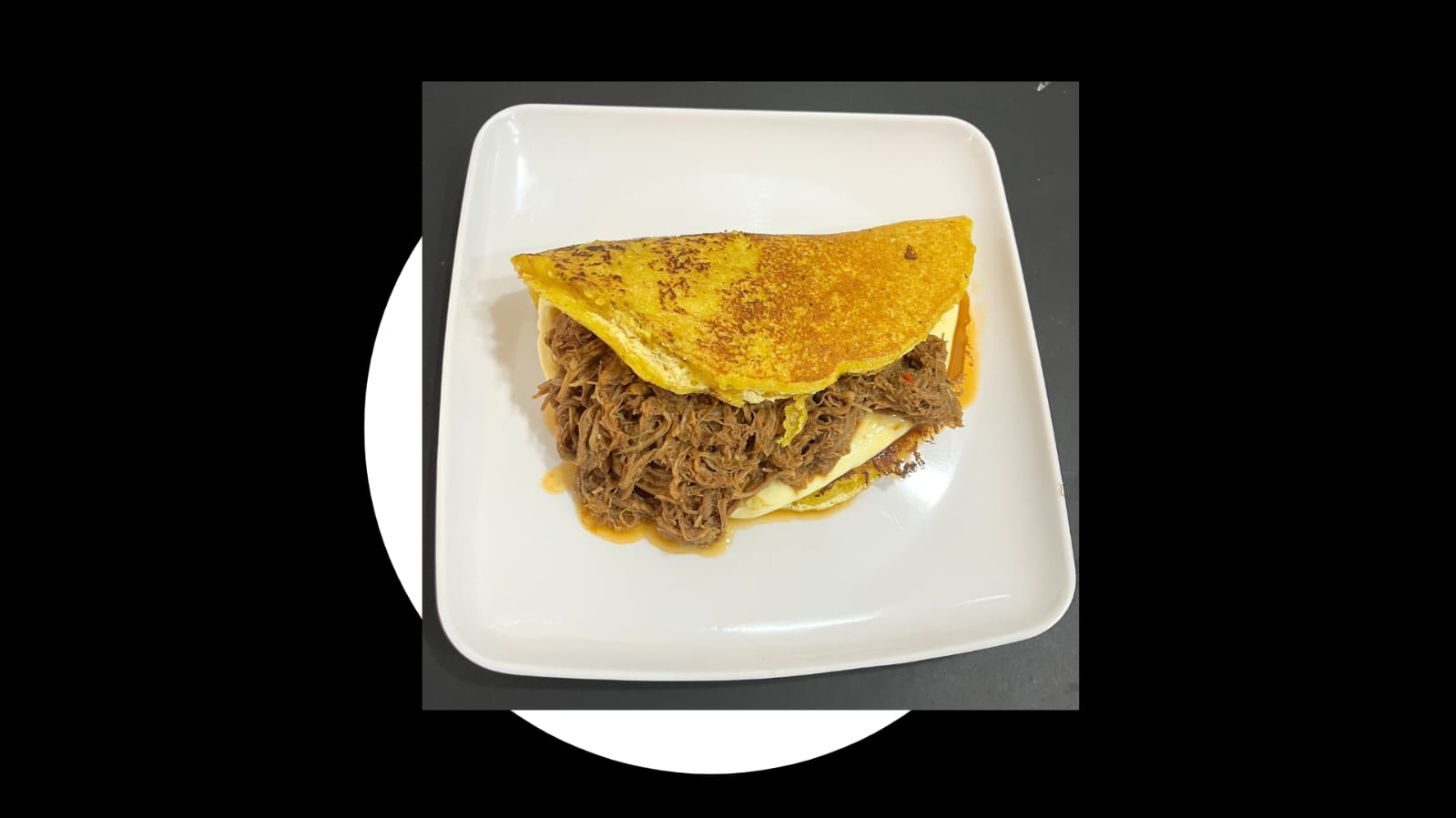Cachapa con queso completo (200 g) y carne mechada.