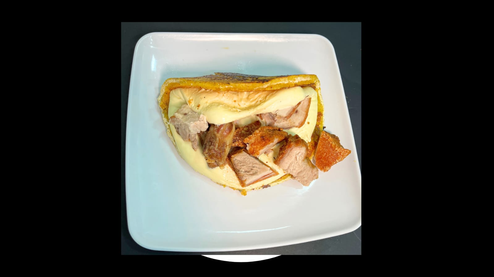 cachapa con queso completo, chicharrón (200 g) y tocineta