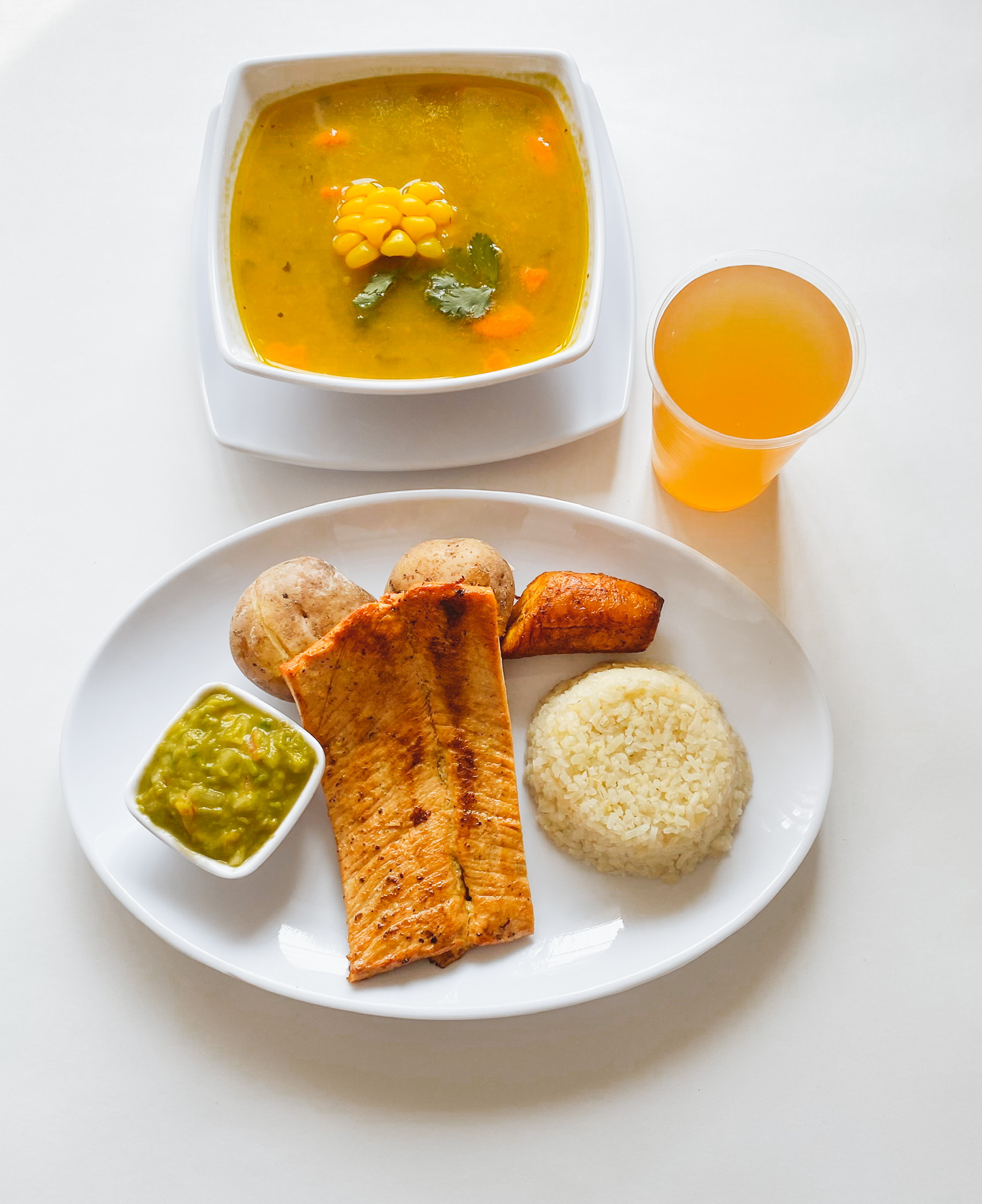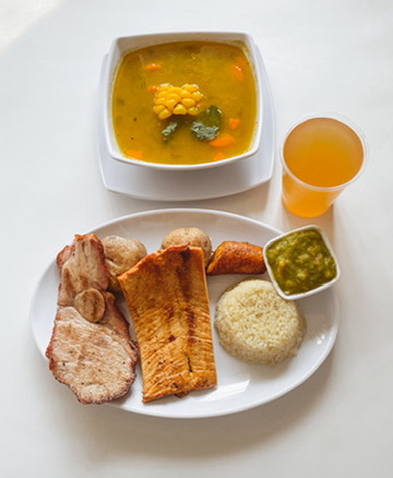 Está compuesto por sopa o fruta, 1 proteína (costilla de cerdo, bondiola, lomo al chigüiro, pechuga), arroz, papa salada, plátano, guacamole y limonada (nota: debe escoger en un topping de sopa o fruta; también debe escoger una carne en un topping)