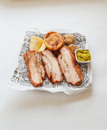 Está compuesto por sopa o fruta, 2 proteína (costilla de cerdo, bondiola, lomo al chigüiro, pechuga), arroz, papa salada, plátano, guacamole y limonada (nota: debe escoger en un topping de sopa o fruta; también debe escoger 2 carne en un topping)