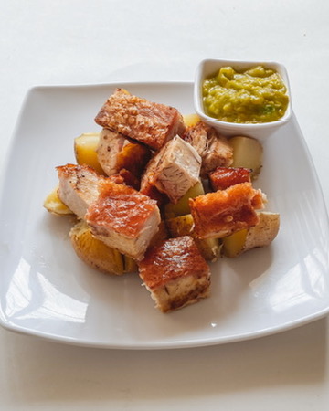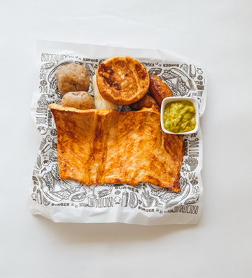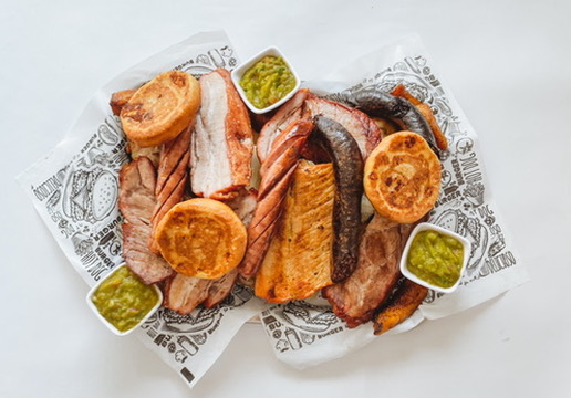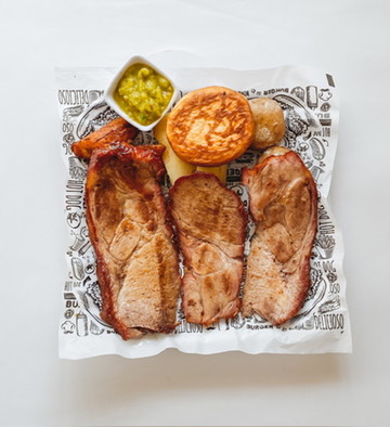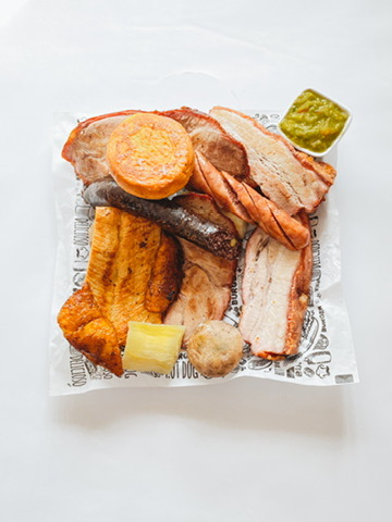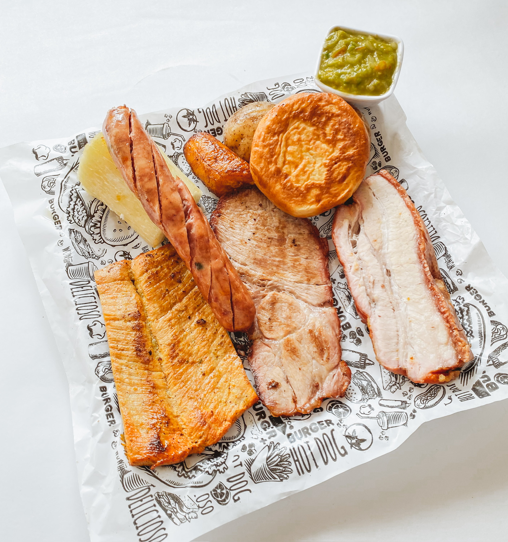 Picada de 3 carnes acompañada con papa salada, plátano, yuca, chorizo o morcilla, guacamole y arepa boyacense. (Nota: debe escoger en un topping de chorizo o morcilla)