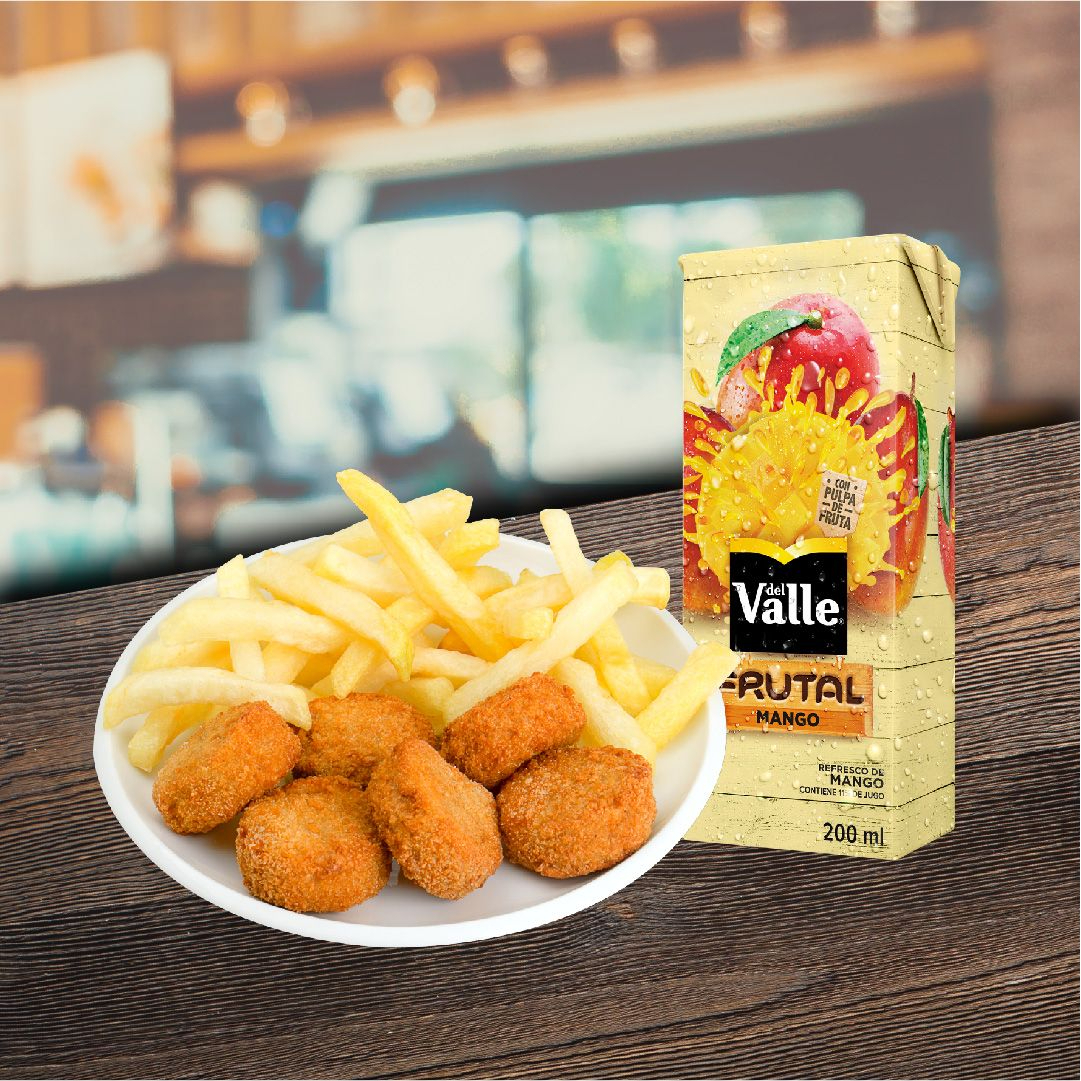 Acompañado de papa francesa, porción de fruta, jugo de caja y porción helado.