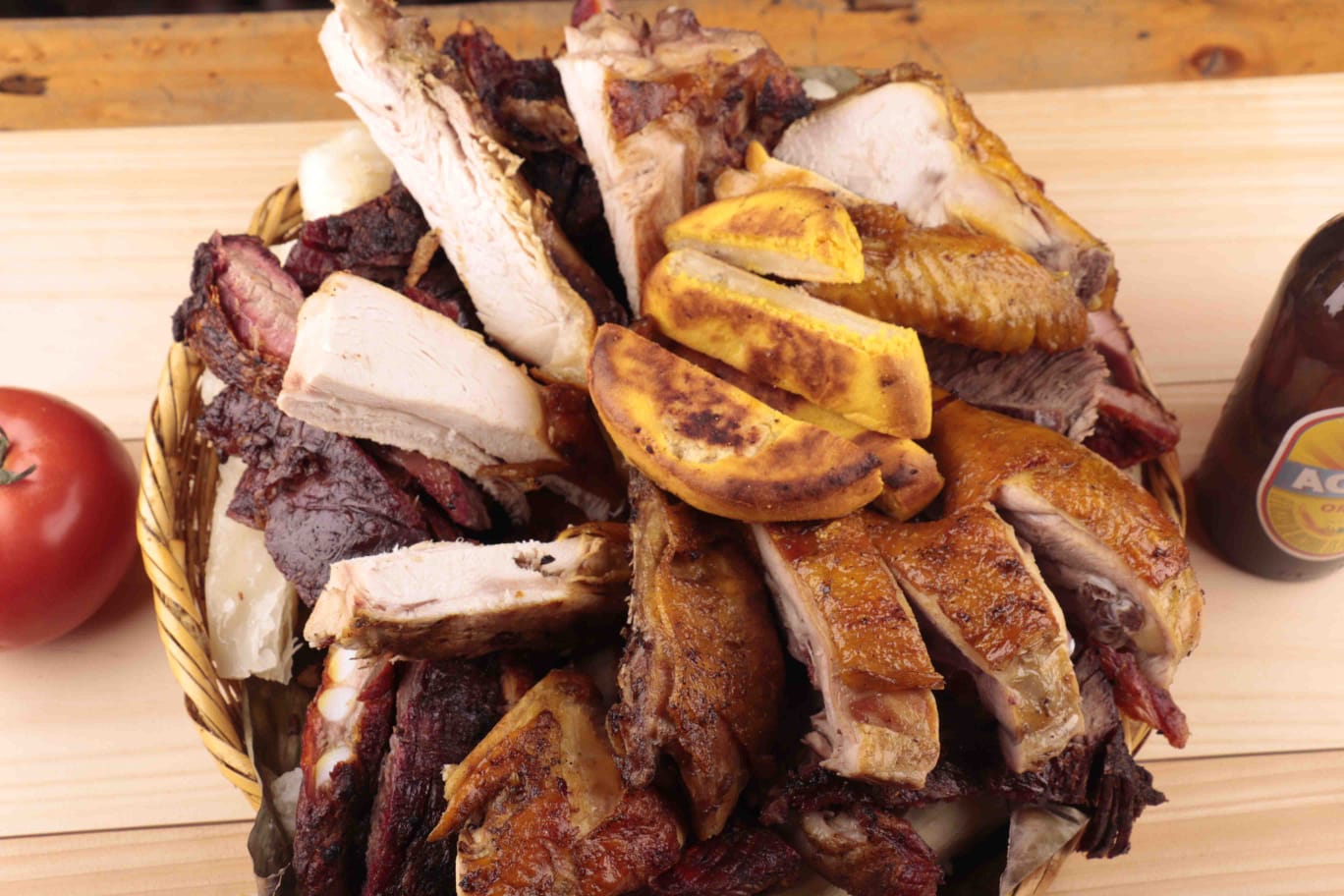 Ternera, chigüire, costillas de cerdo, 1 gallina asada, papa salada, plátano, yuca, arepa boyacense y guacamole.