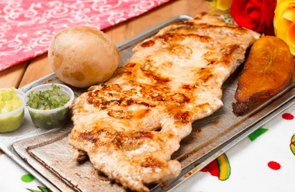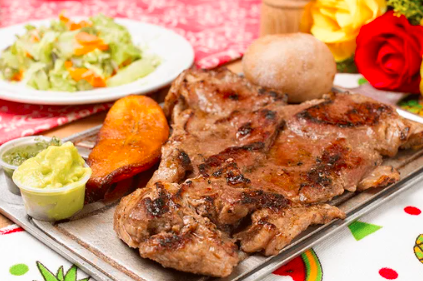 Churrasco de 400 gr Acompañado de arroz, papa salada, plátano y ensalada.