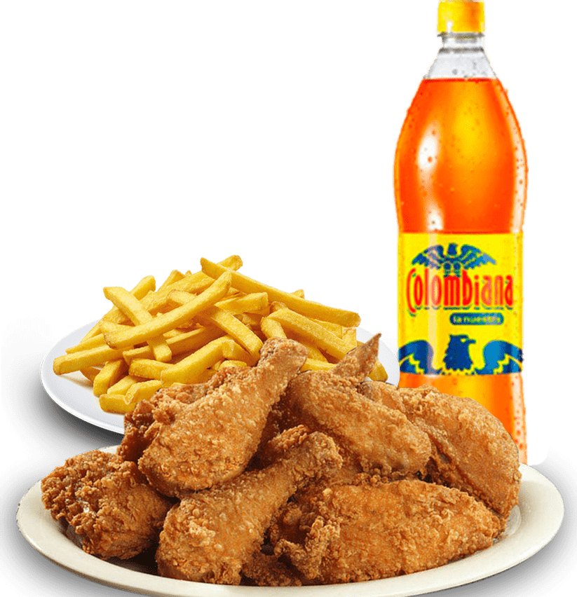 Deliciosos medio polllo al broaster acompañado de papa a la francesa, arepa y gaseosa 1.5