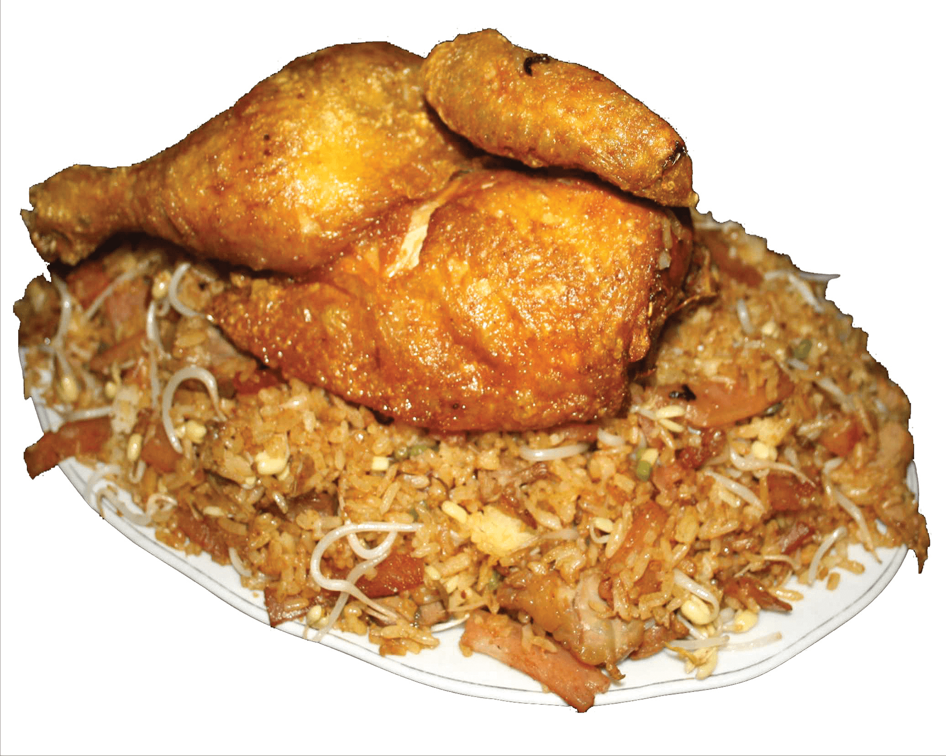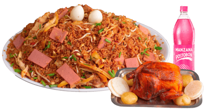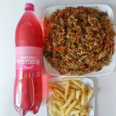 Caja de Arroz Chino con pollo desmenuzado, jamon, carne de cerdo, raices chinas, con verduras salteadas, un Pollo asado con papas a la francesa y Gaseosa 1LT