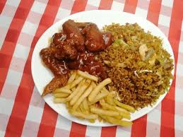 Caja de Arroz Chino con pollo desmenuzado, jamon, carne de cerdo, raices chinas, con verduras salteadas, Pollo o Costillas con papas a la francesa