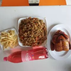 Caja de arroz chino con verduras salteadas al wok y carnes picadas con un pollo asado, papas a la francesa y gaseosa 1 litro.