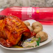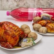 1 Pollo y medio asado, acompañado de porción de arepa, 2 porciones de papa salada, porción de plátano y gaseosa Coca-Cola 1 litro.