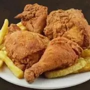 cuarto de pollo broaster acompañado de papa y arepa