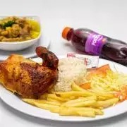 Arroz blanco con papas a la francesa + 1/4 de pollo asado + sopa del día + gaseosa 250 ml.