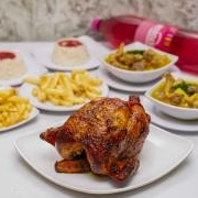 1 pollo asado, acompañado de 2 sopas del día, 1 porción de papa salada, 1 porción de arepa, 2 papas a la francesa y gaseosa Coca-Cola 1.5 litros.