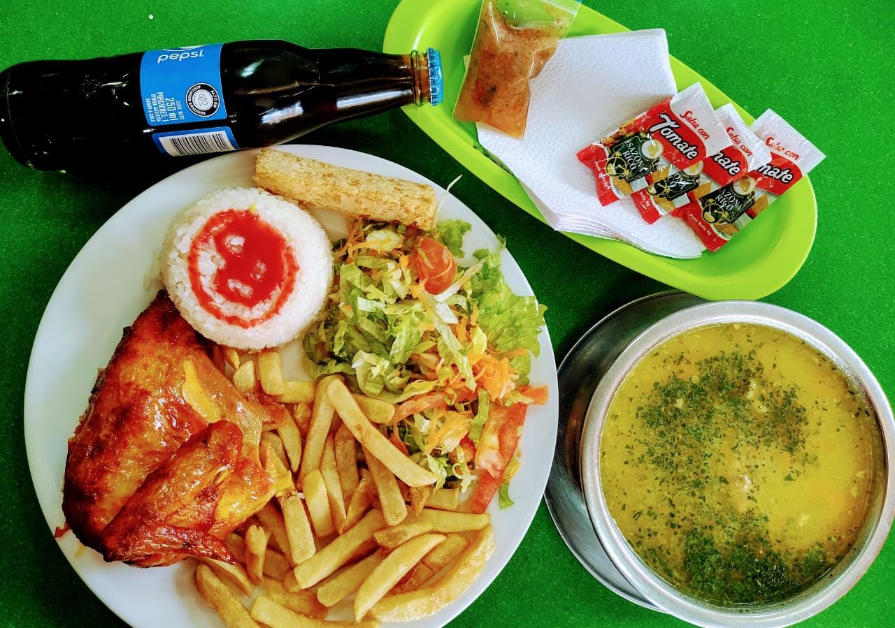 Medio pollo, sopa de manudencias y porcion de arroz, gaseosa mini 250ml.