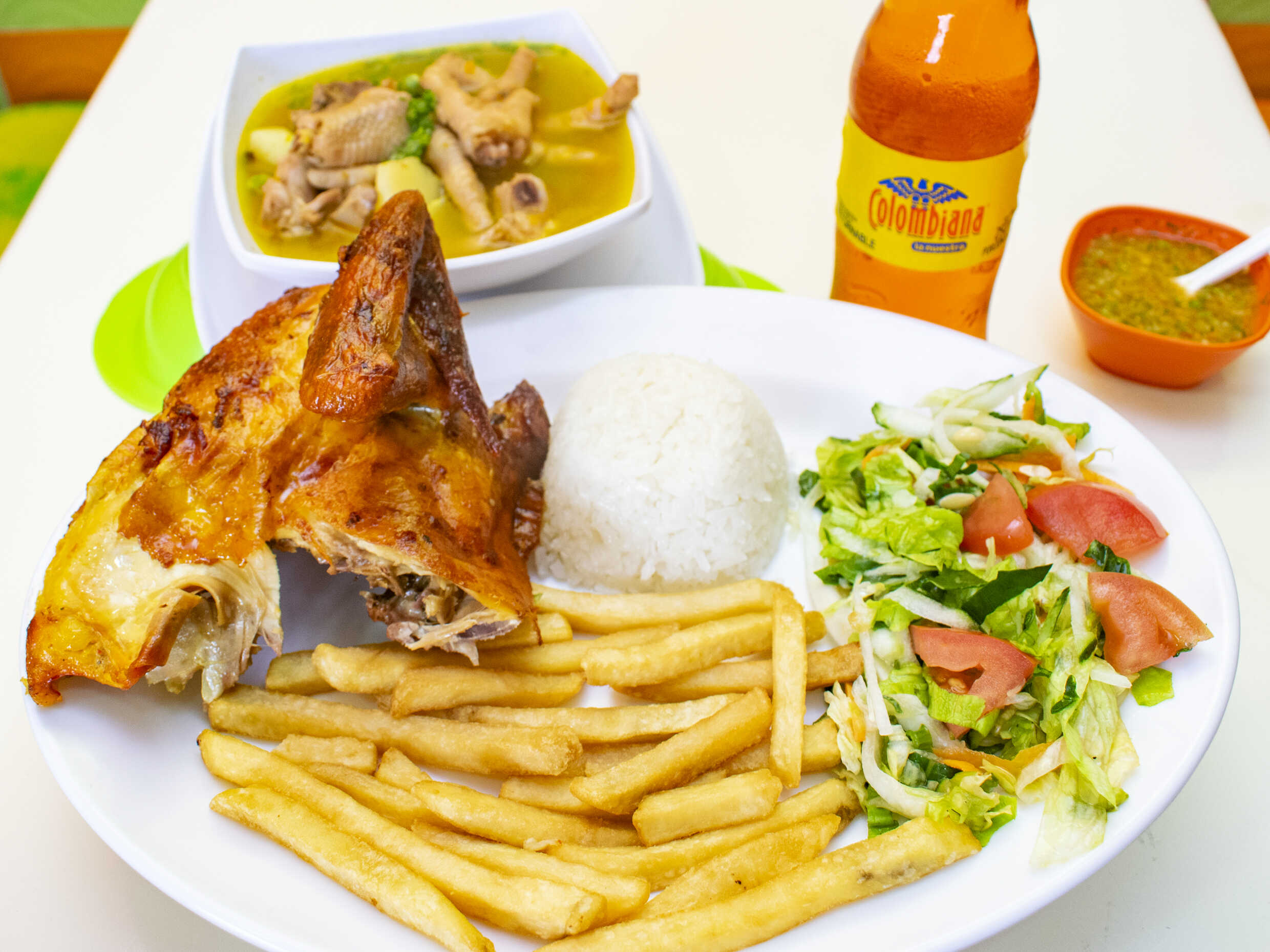 1 Pollo y medio, papa salada, plátano, arepa y gaseosa 1.5 L.
