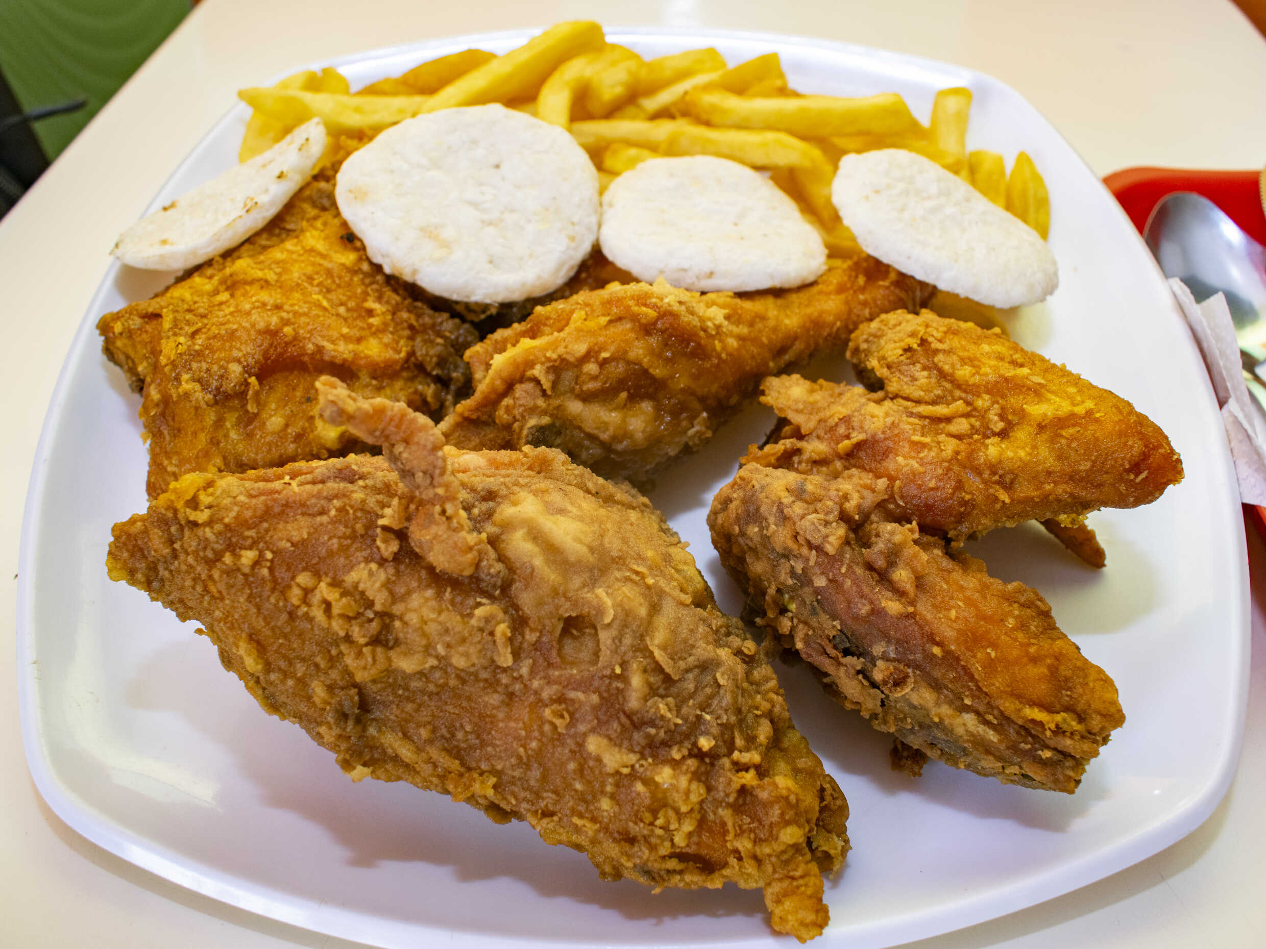 Bandeja con pollo, arroz, papa francesa, yuca y ensalada.