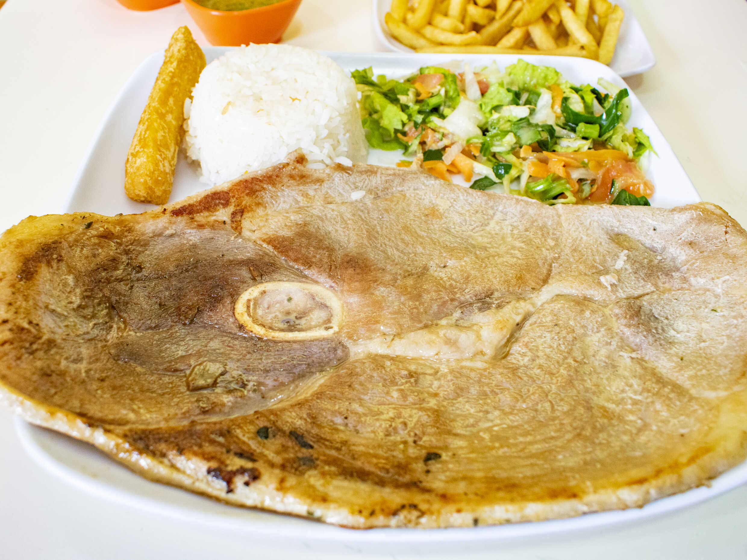 Churrasco, arroz, papa francesa, yuca y ensalada.