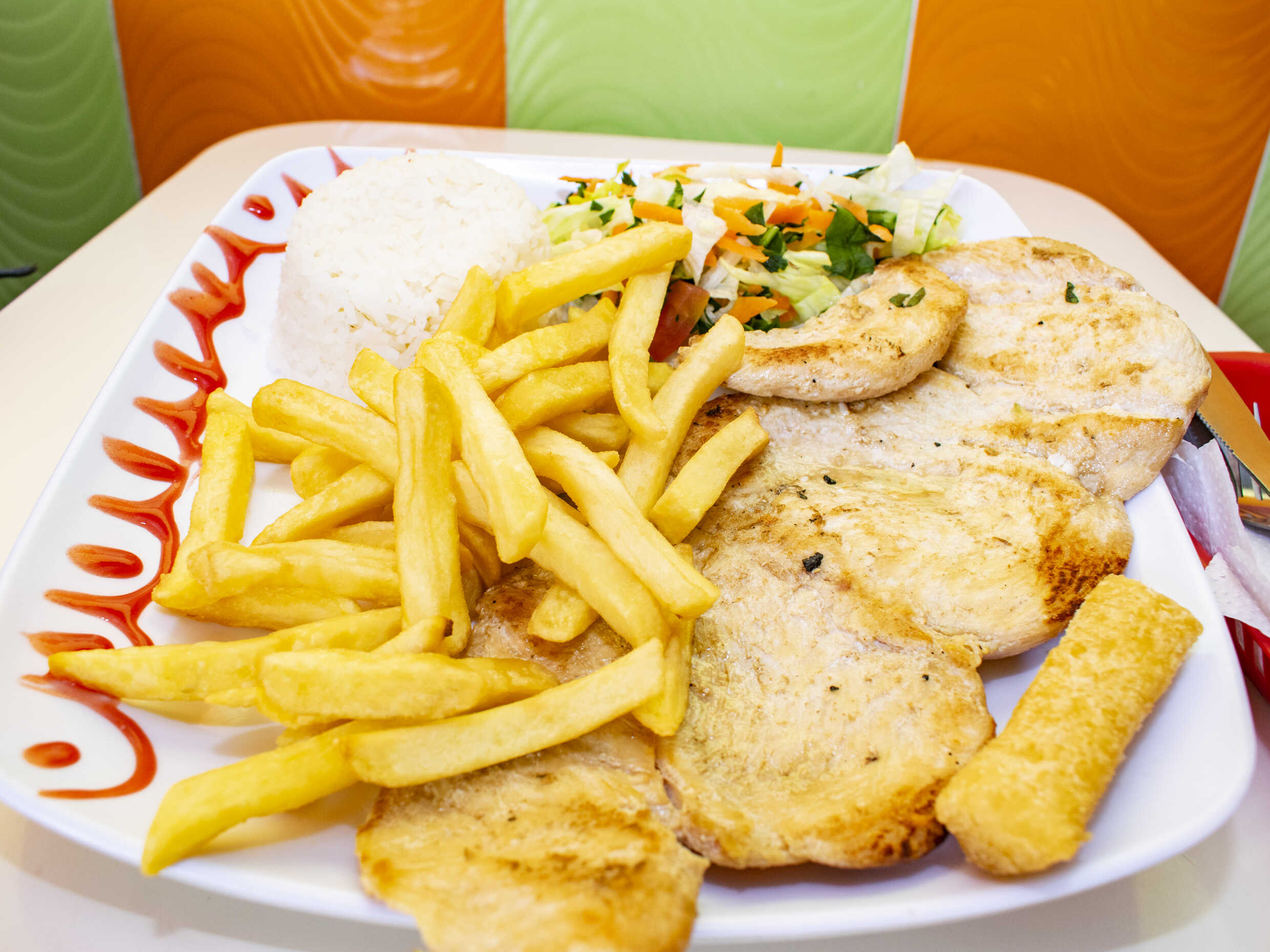 Pechuga a la plancha, arroz, papa francesa, yuca y ensalada.