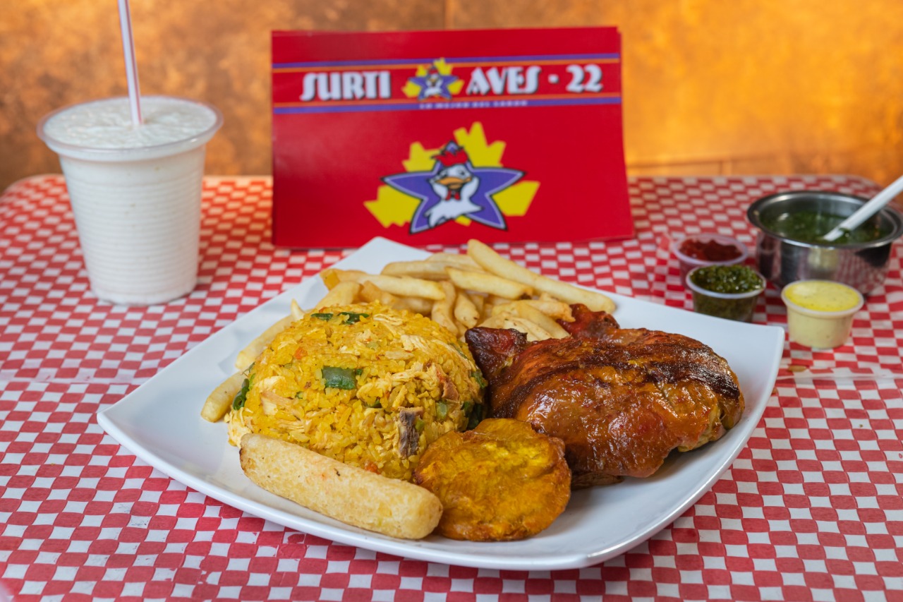 Arroz chino con papa a la francesa y 1 pollo asado con papa salada y arepa.