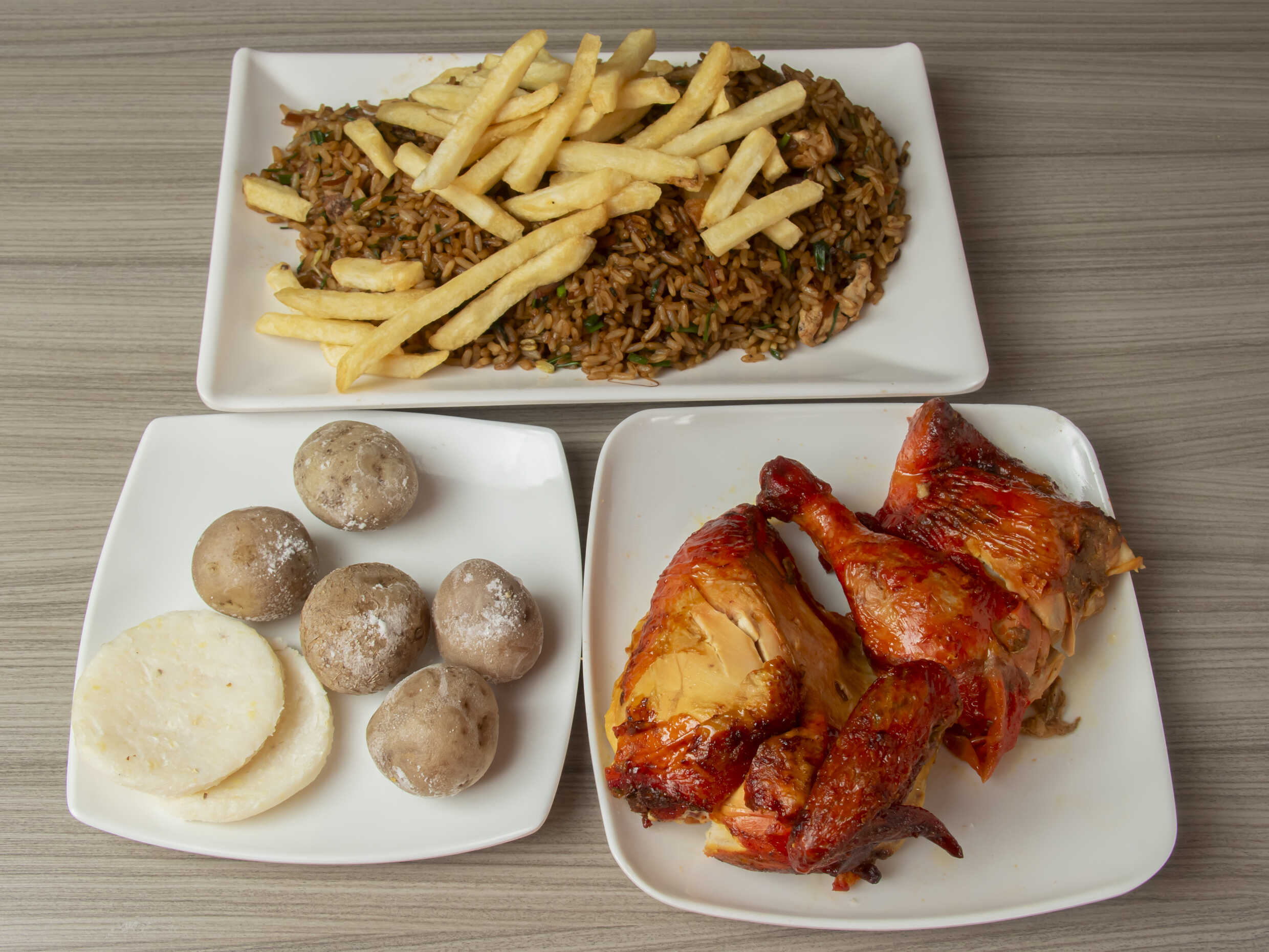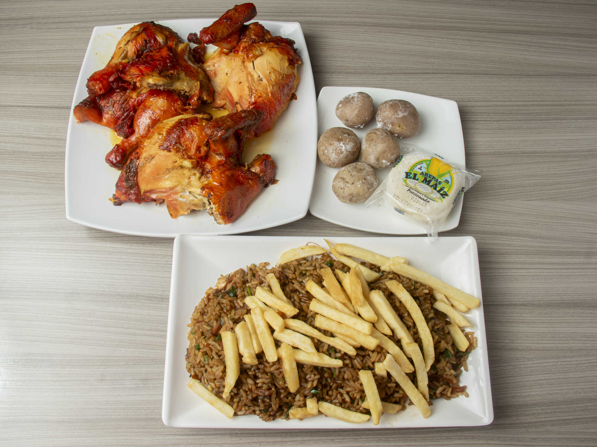 Arroz chino con papa a la francesa y 1/2 pollo asado con papa salada y arepa.