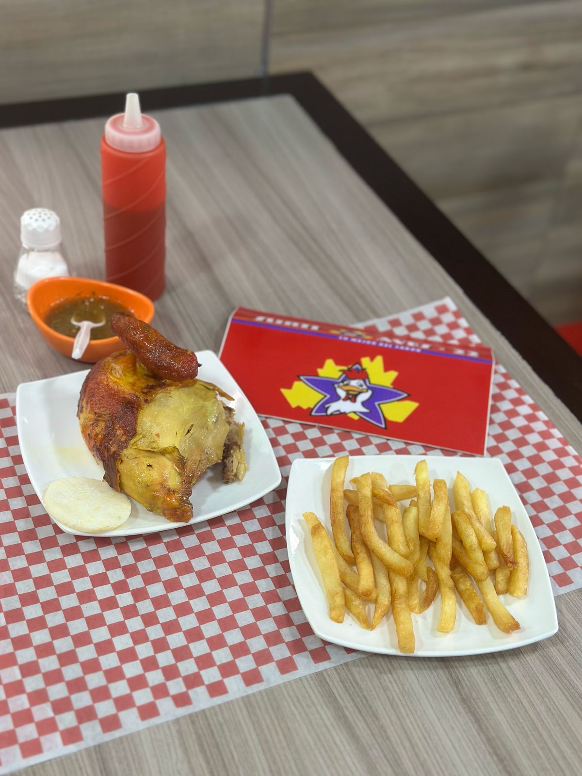 Cuarto de pollo asado y porción de papa francesa.