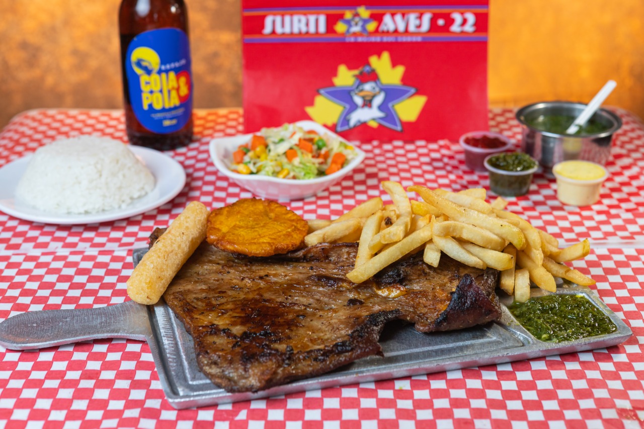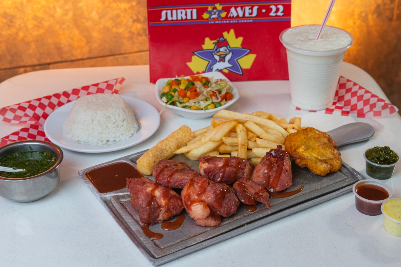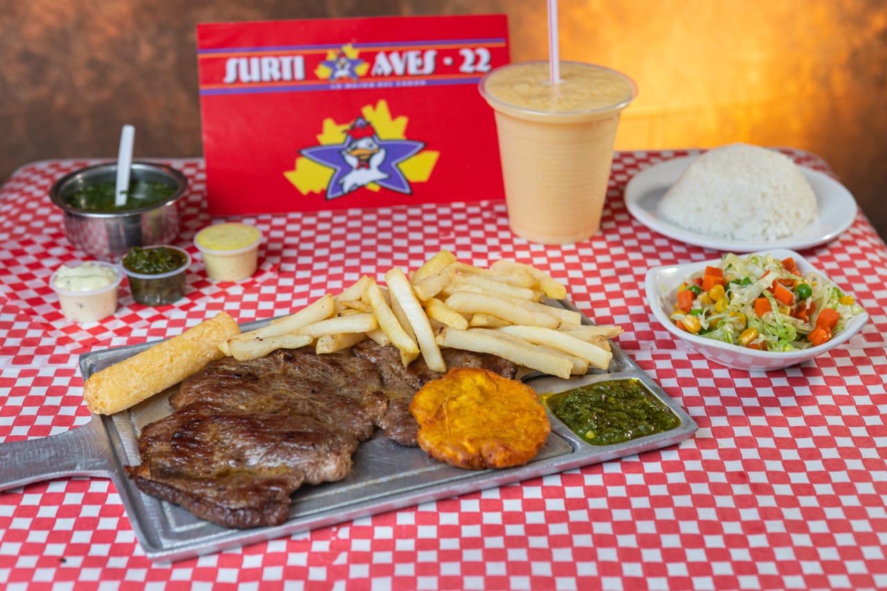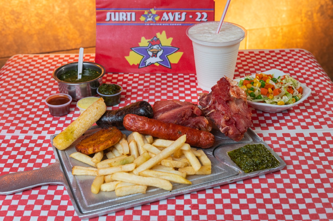 Carne de res, pechuga de pollo, papa francesa, 1 yuca y ensalada.