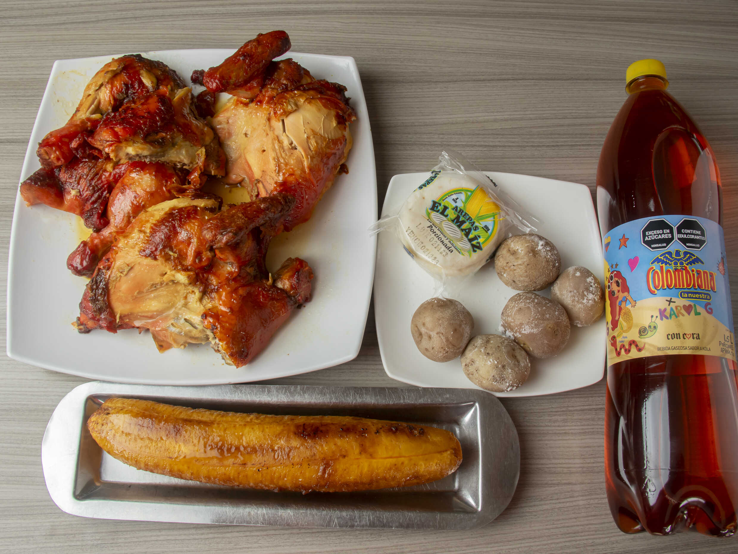 1 Pollo asado, papa salada, arepas, plátano sencillo y gaseosa 1 L Postobón.